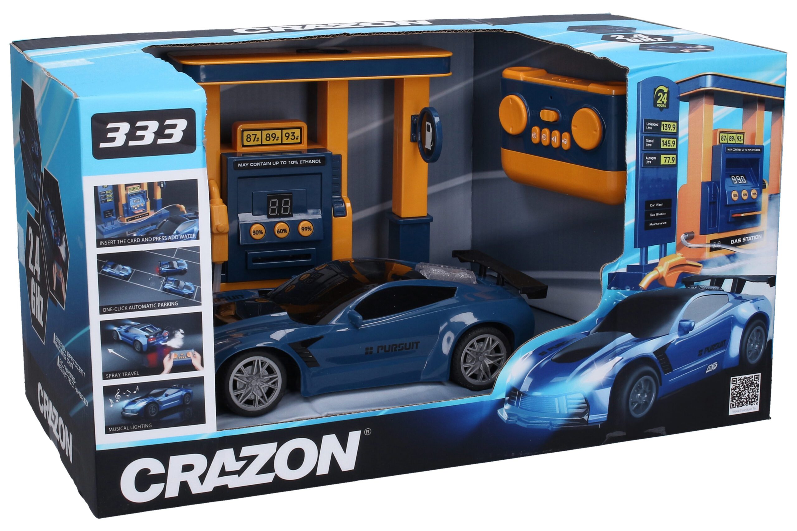 Auto dýmící s čerpací stanicí RC na dálkové ovládání. Rozměry auta 22x10x6 cm. Frekvence 2.4GHz. Světelné, zvukové, dýmící efekty. 4xAA do auta, 2xAAA do ovladače, 3xAA do čerpací stanice nejsou součástí. Čerpací stanice slouží jako nádrž na vodu, která se z ní doplňuje čerpací pistolí (hadicí) do auta do nádržky nad zadním pravým kolem pro následné dýmící efekty. Vložte kartu do čerpací stanice dlouze stiskněte (držte) jedno z tlačítek 30%, 60%, 90% pro čerpání vody. Ovladač – přepínač ON/OFF, světelný dýmící efekty, automatické parkování, zvukové efekty.