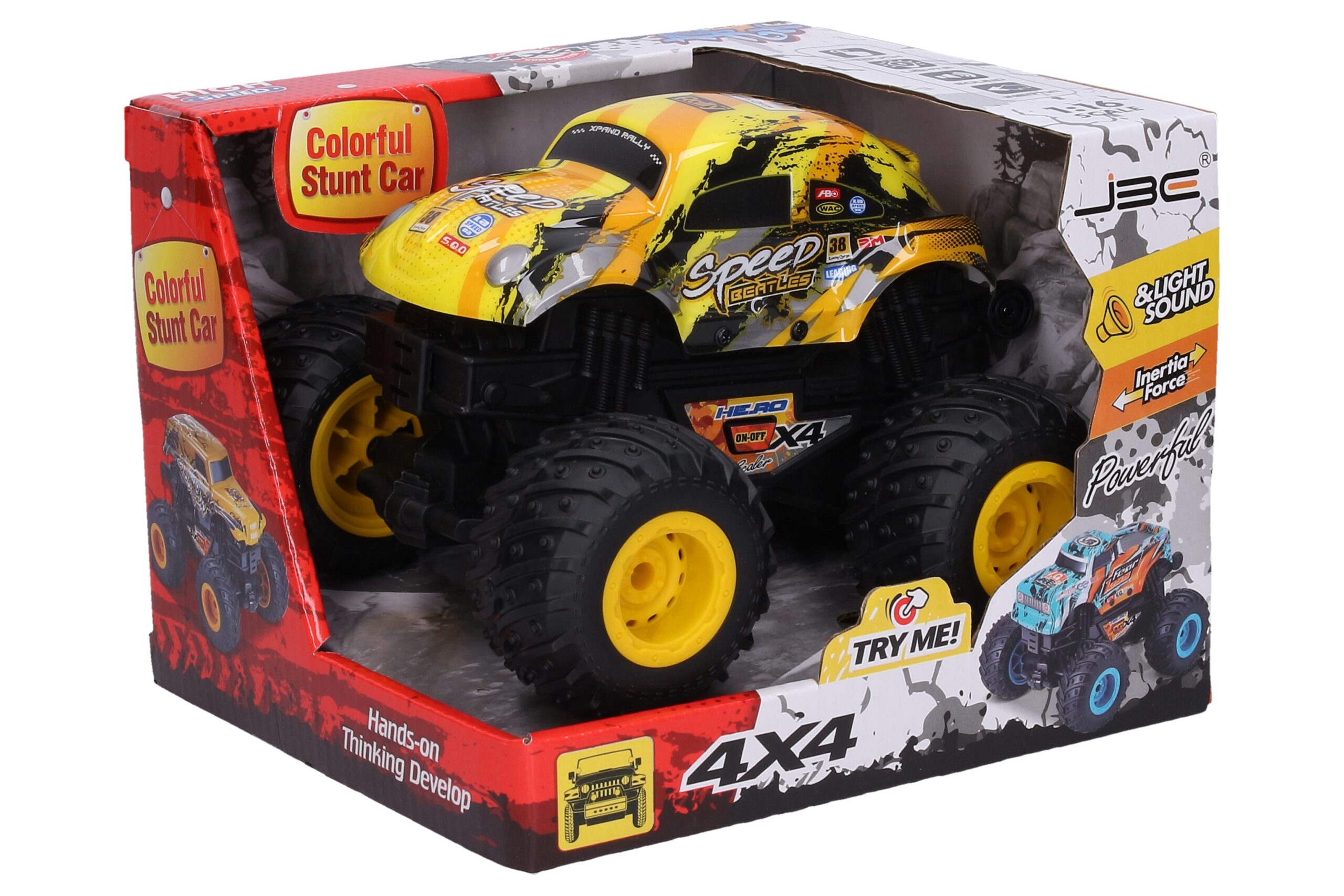 Auto. Rozměry 19x17x13 cm. Na setrvačník. Světelné a zvukové efekty. 4xAG13 baterie součástí. 2 varianty – zelená, žlutá.