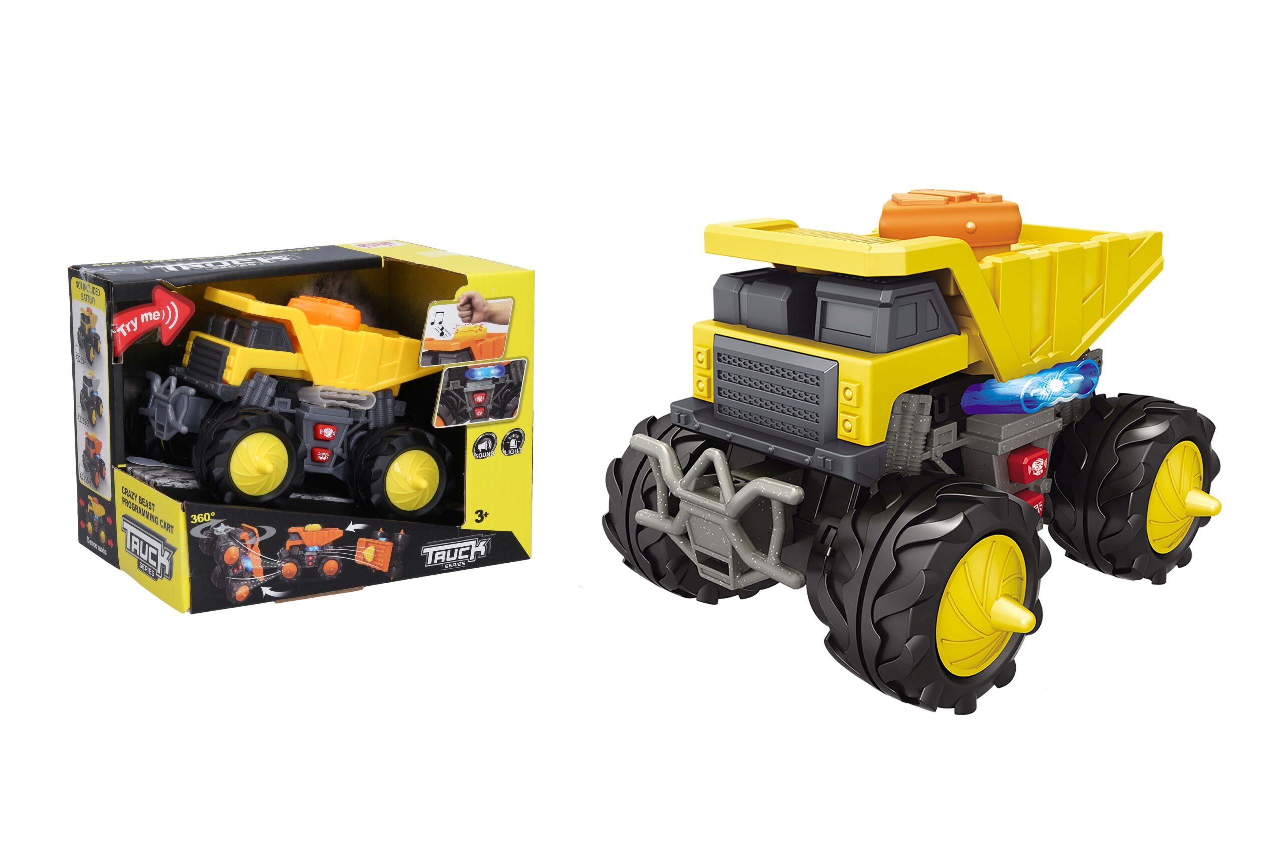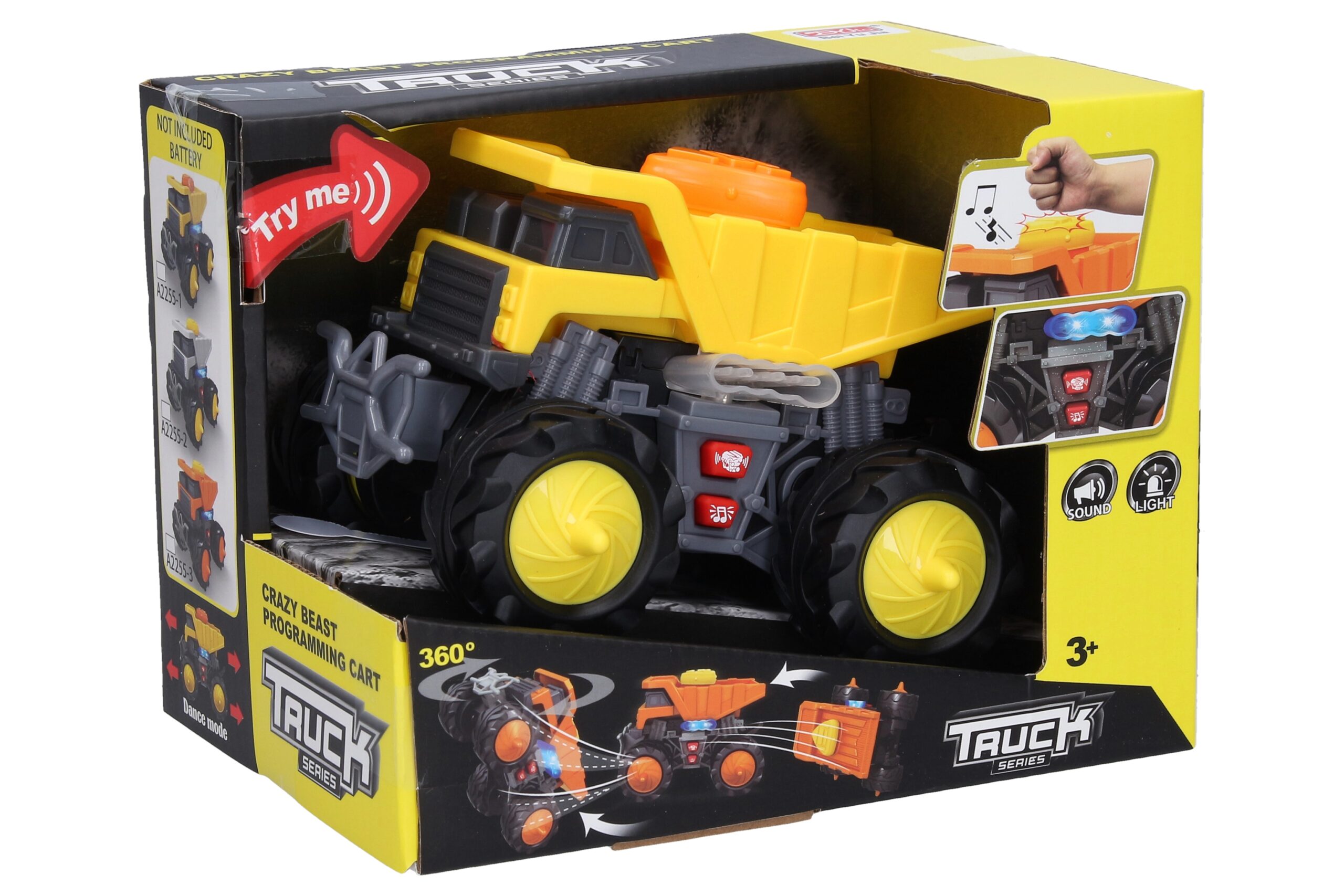 Auto sklápěč s efekty. Rozměry 15,5×13,5×10,5 cm. Světelné, zvukové a pohybové efekty tlačítkem na nakládací ploše a postranními tlačítky (zvuk motoru, hudba, jízda dopředu, dozadu). 3xAAA baterie součástí.