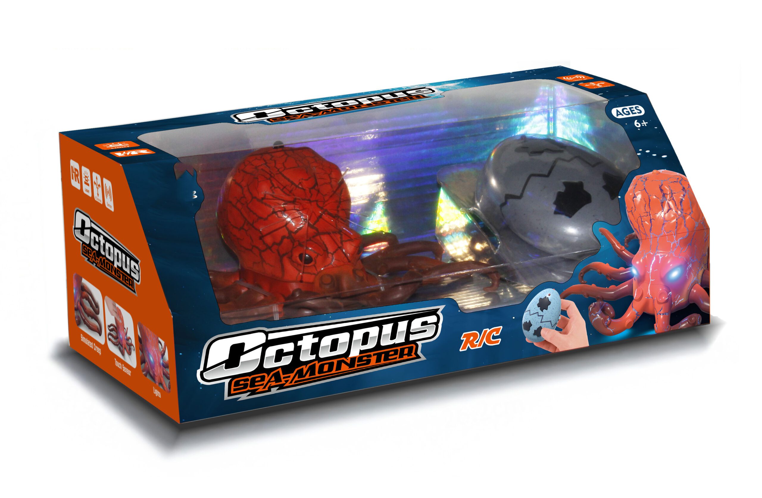 Chobotnice RC na dálkové ovládání. Rozměry 17x12x7 cm. Infračervený port. Světelné efekty očí. 3xAAA baterie do chobotnice, 2xAAA do ovladače nejsou součástí. Dotykem čela aktivace efektů. Ovladač – tlačítko chůze dopředu, tlačítko otáčení vlevo, tlačítko otáčení vpravo, zaráz obě tlačítka otáčení – chůze dozadu, přepínač kanálů A,B,C. Přepínač ON/OFF na spodní straně chobotnice. Provoz až 45 min, dosah 8 m.