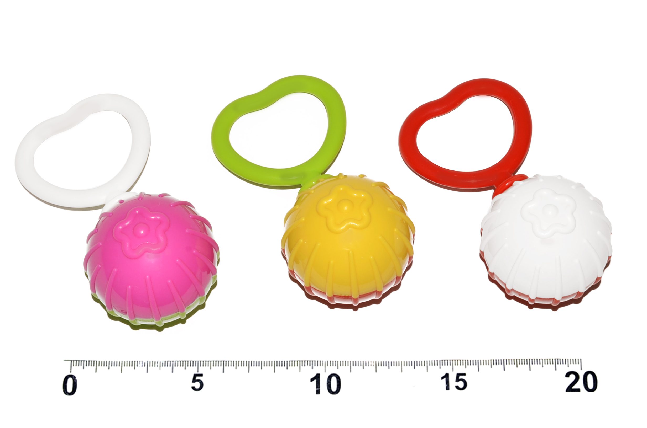Chrastítko – koule na srdíčku. Stimuluje smysly sluchu, zraku i hmatu dítěte a zároveň se cvičí uchopovací reflex. Chrastítka splňují náročné hygienické normy, jsou bez ostrých hran a bez uvolnitelných malých částí. Různé barevné varianty – červená, mentolová, modrá, růžová, zelená, šedá, bílá.