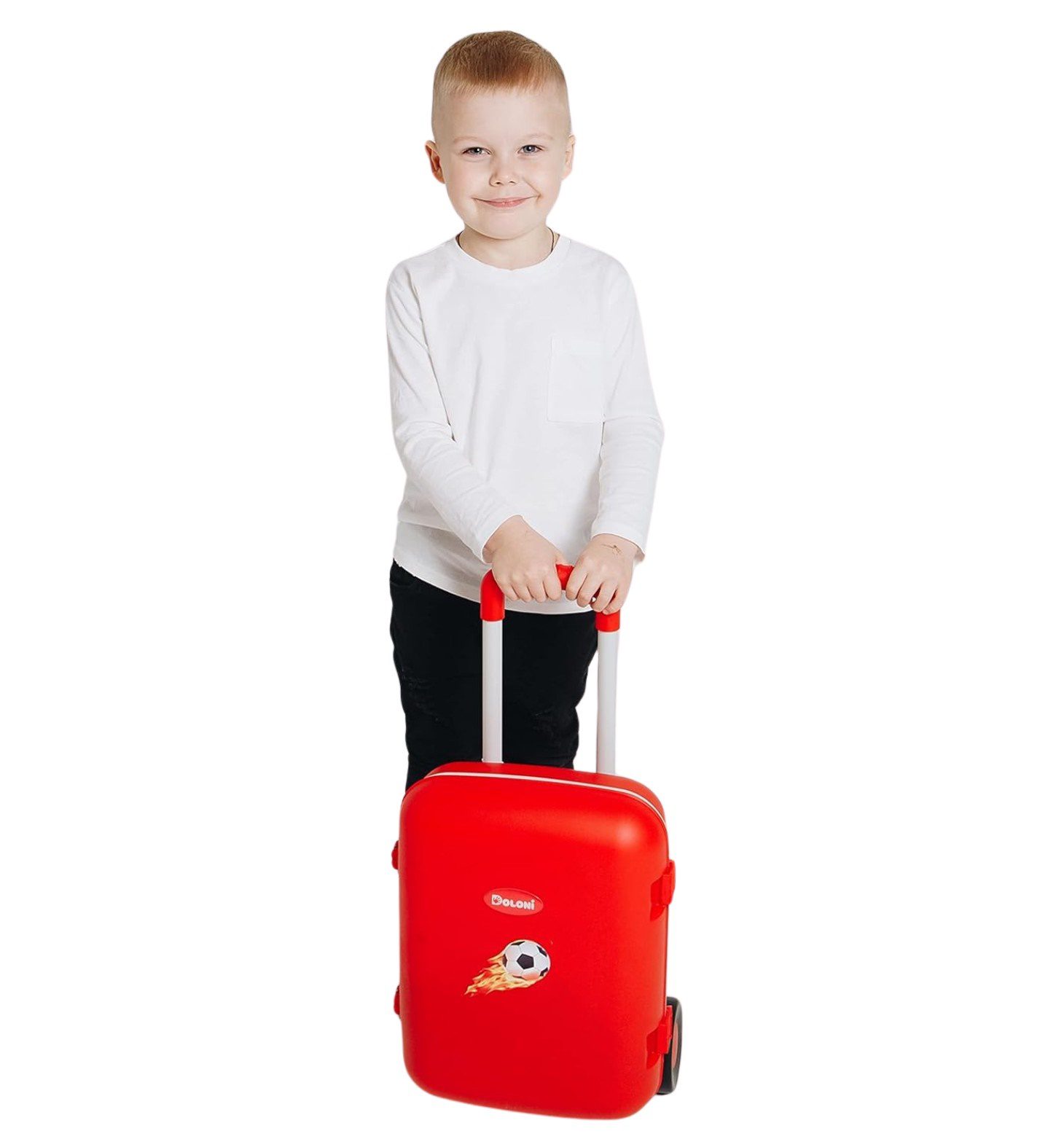 DOLONI Kufr dětský cestovní červený. Své oblíbené a nejpotřebnější věci si můžete dát do kufru a vyrazit na dovolenou na exotický ostrov. Kufr je poměrně objemný a dítě se do něj může naučit dávat své věci, čímž získá užitečné dovednosti a zároveň si bude hrát. Materiál: plast Rozměry: výška kufru: 38 cm výška s vysunutou rukojetí: 62 cm šířka: 28 cm hloubka: 14 cm Pro děti od 3 let