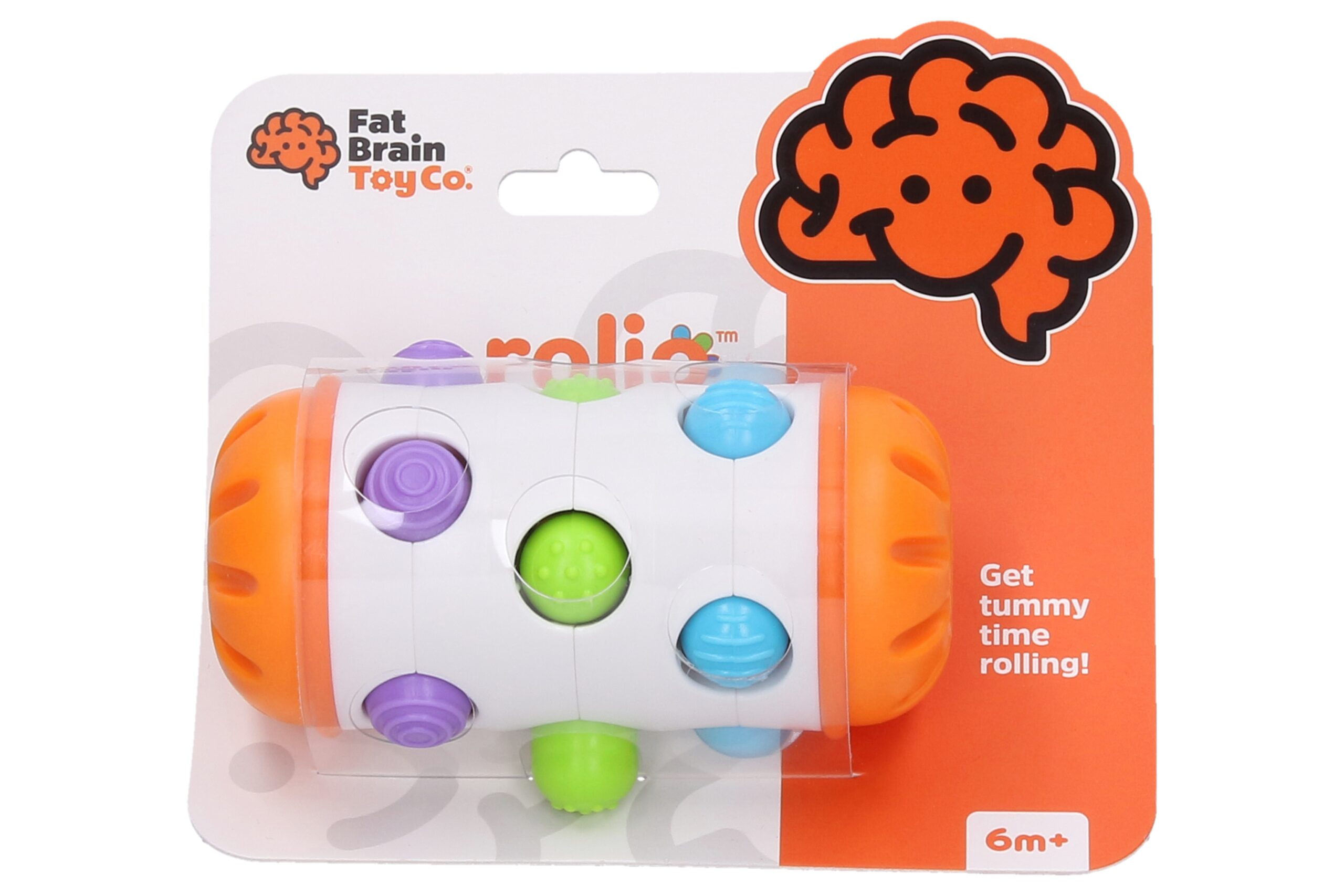 Fat brain Rolio váleček s kolíčky. Velikost 11 cm. Kolíky mají různé textury, při válení válce vydávají zvuk. Kolíky je možné libovolně posouvat. Ideální hračka pro lezoucí miminka.