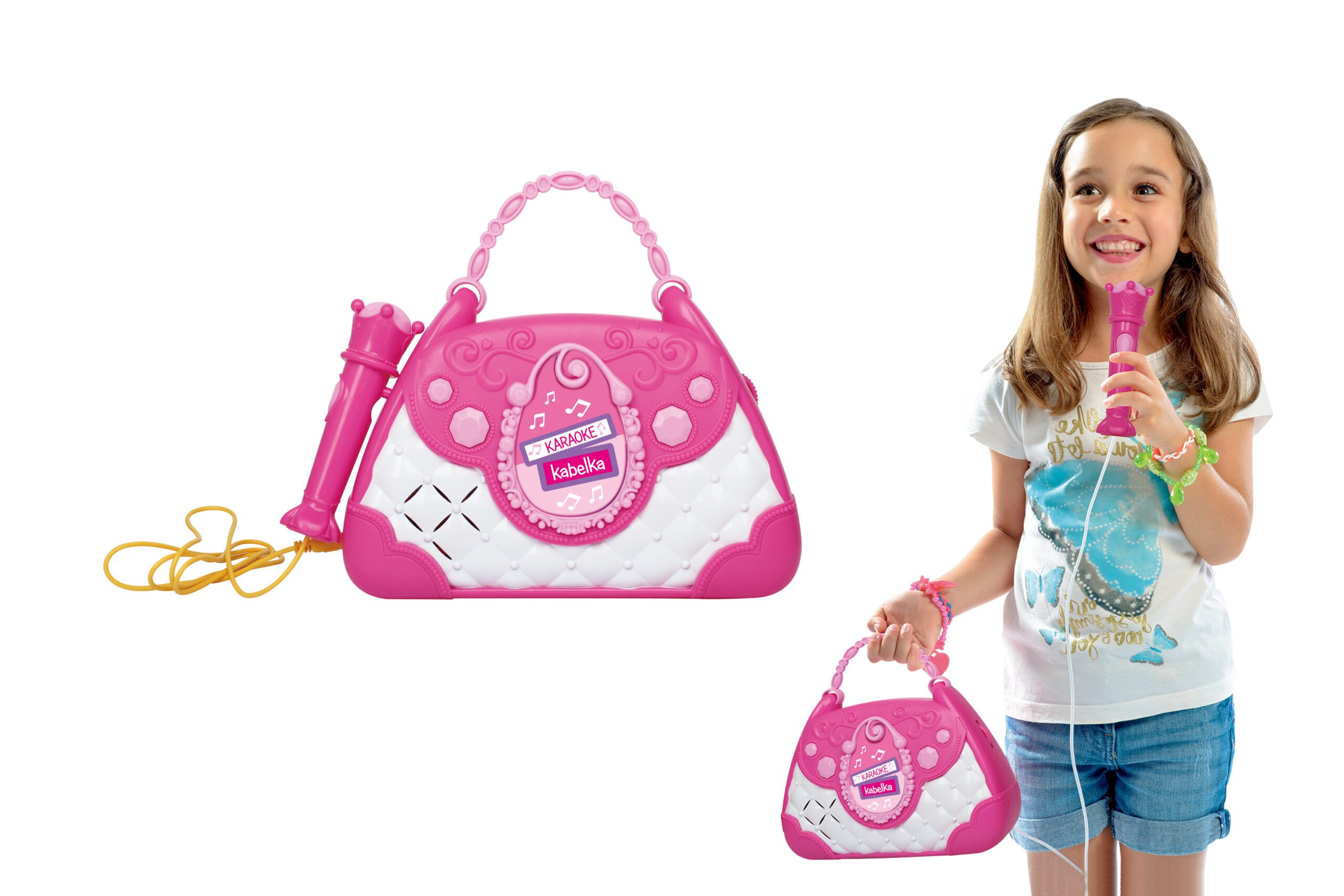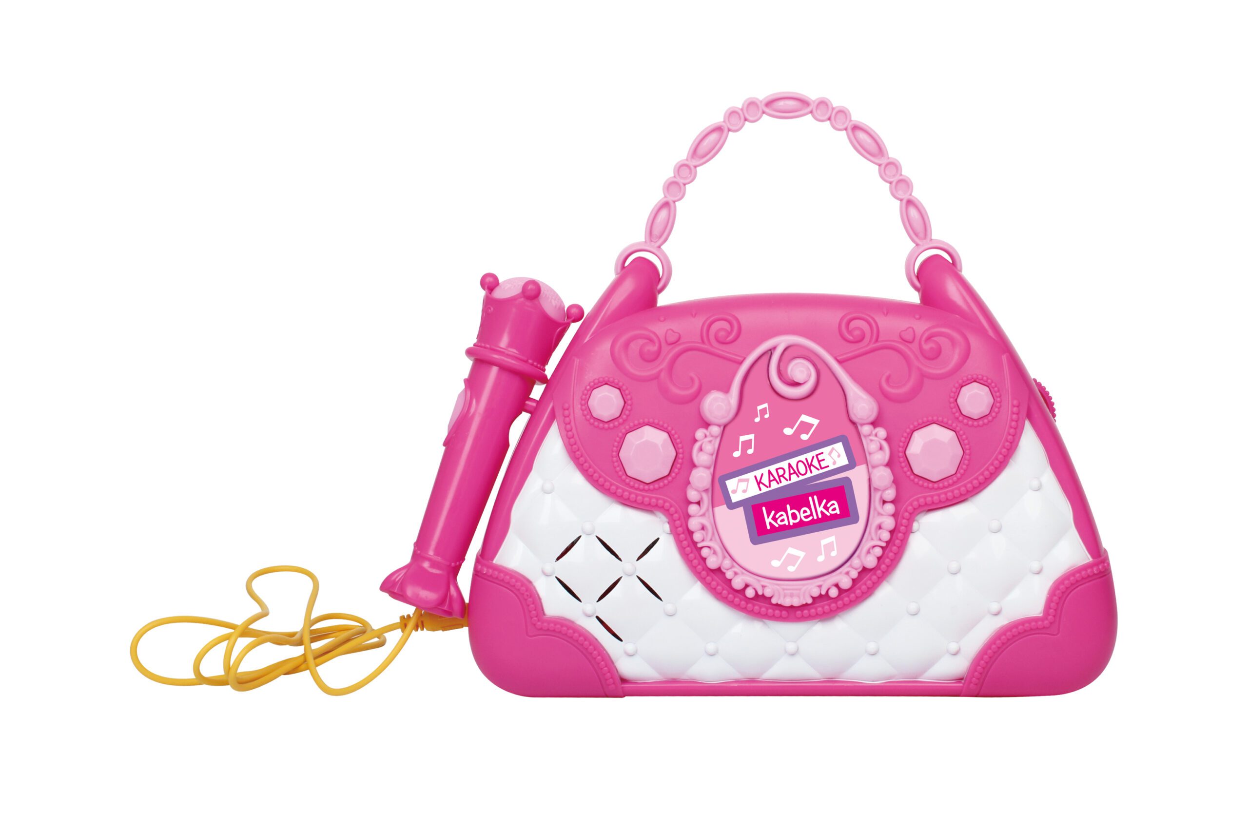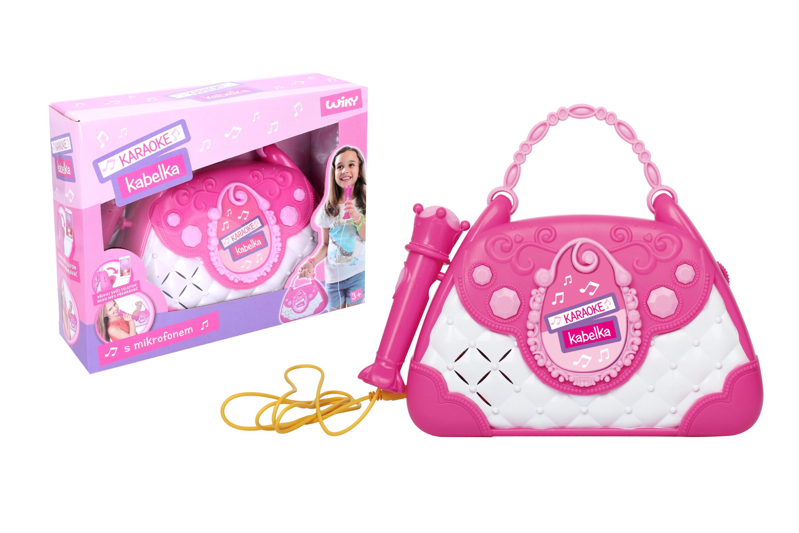 Karaoke kabelka. Světelné a zvukové efekty. Součástí mikrofon, vstup pro telefon a mp3 přehrávač, 2 tlačítka – efekt potlesku, vestavěné melodie. Přepínač ON/OFF. 3xAA baterie nejsou součástí.