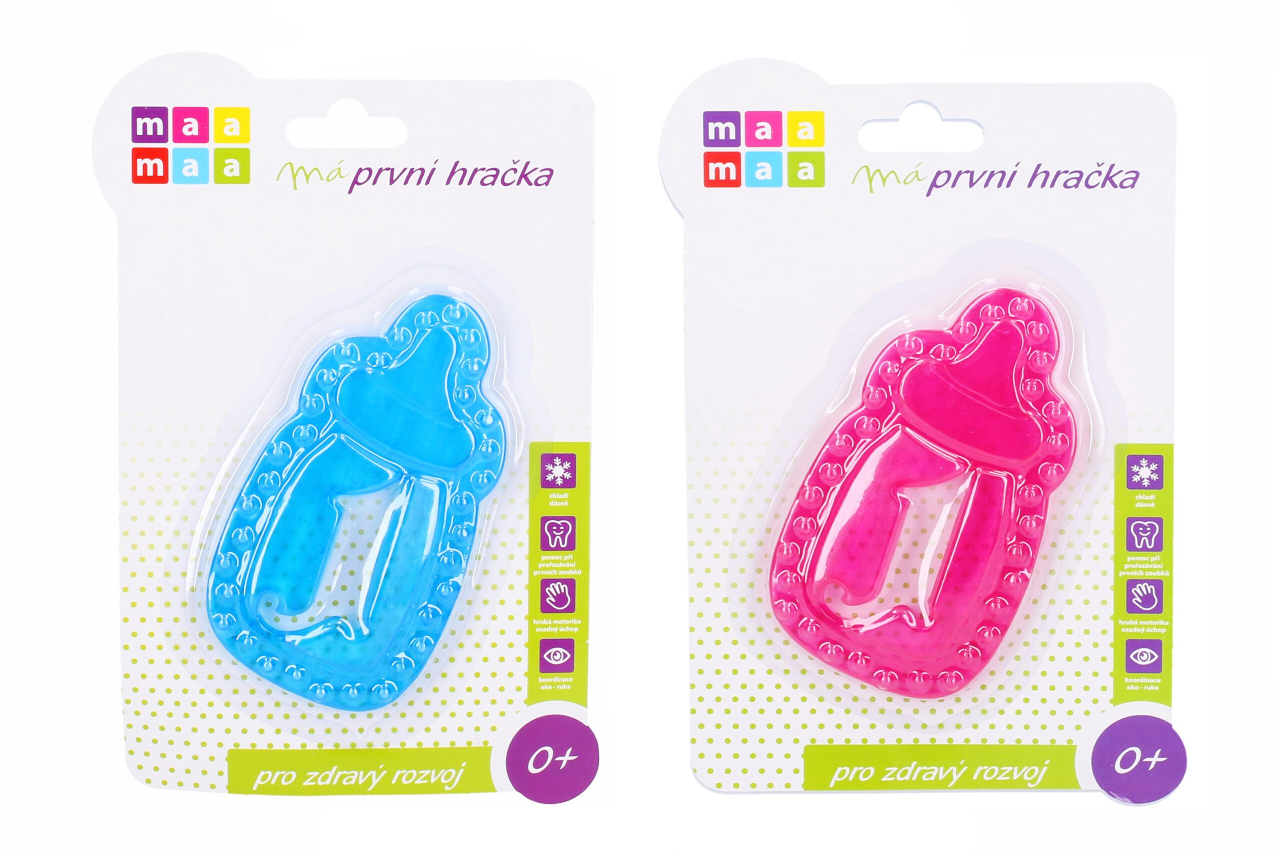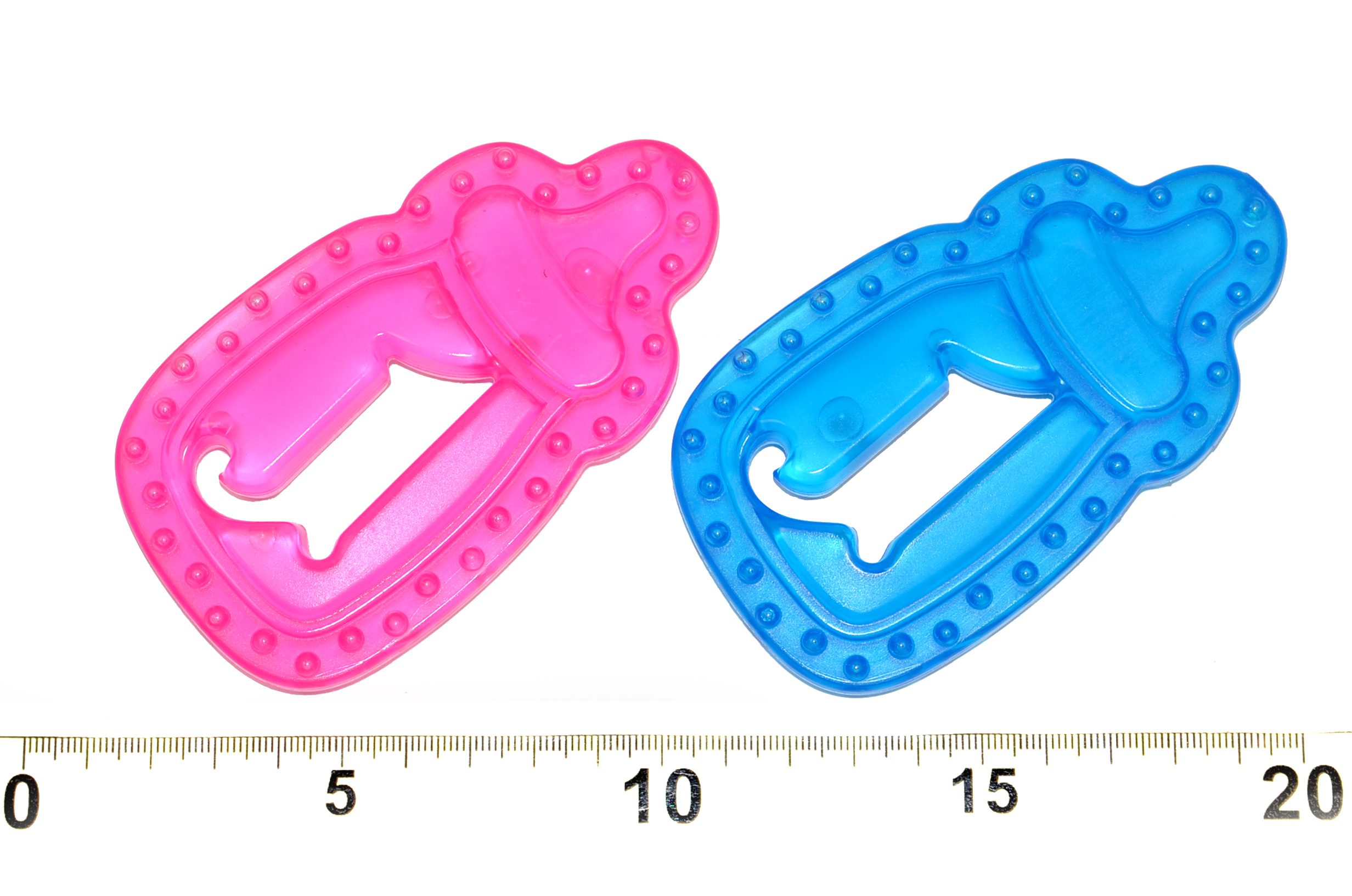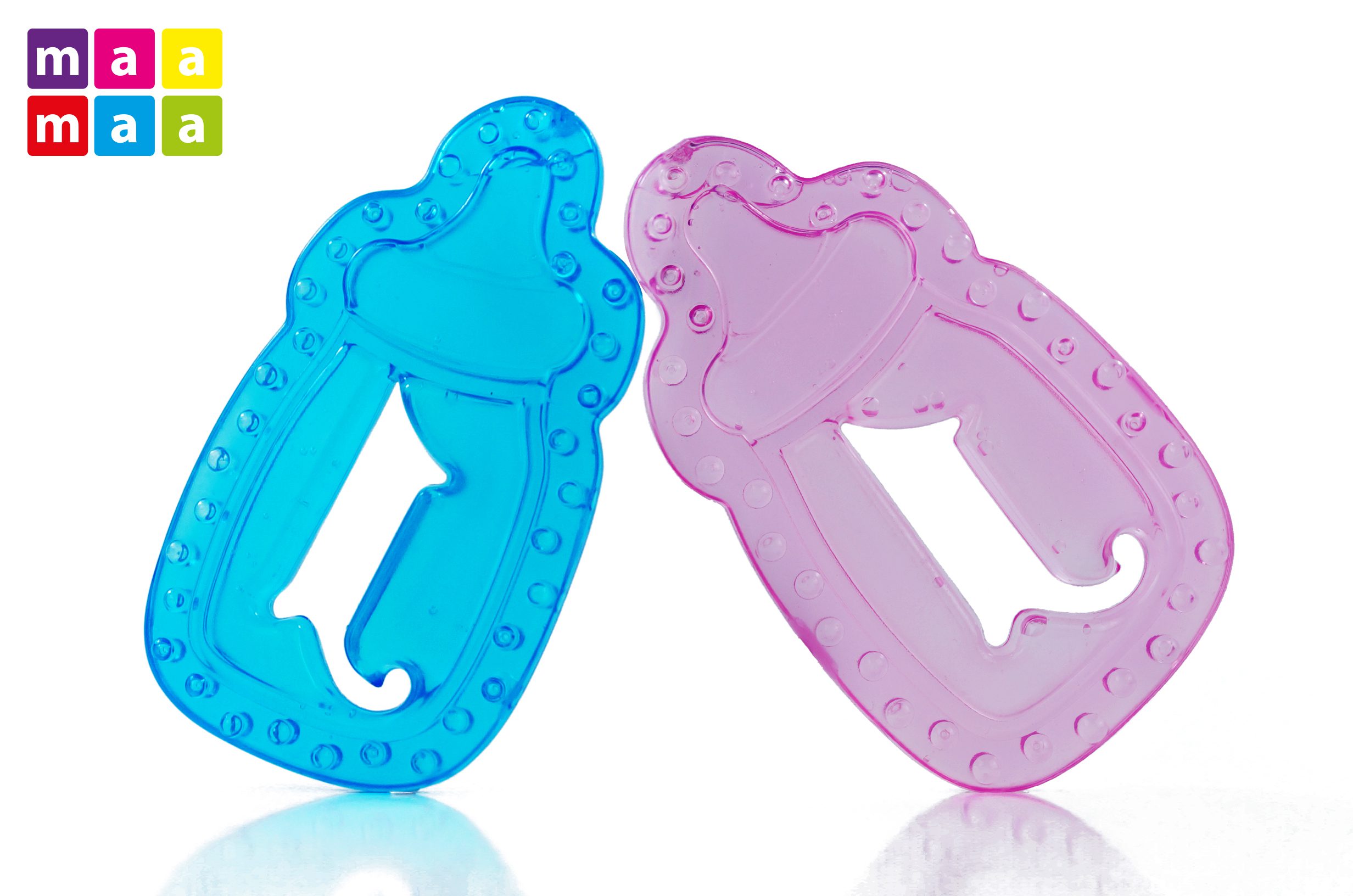 Chladící kousátko ve tvaru láhve je dodáváno ve dvou barevných provedeních – modrá a růžová. Kousátko je vyrobeno z měkkého materiálu, je plněný nezávadným gelem. Skvělá stimulace bolavých dásní.