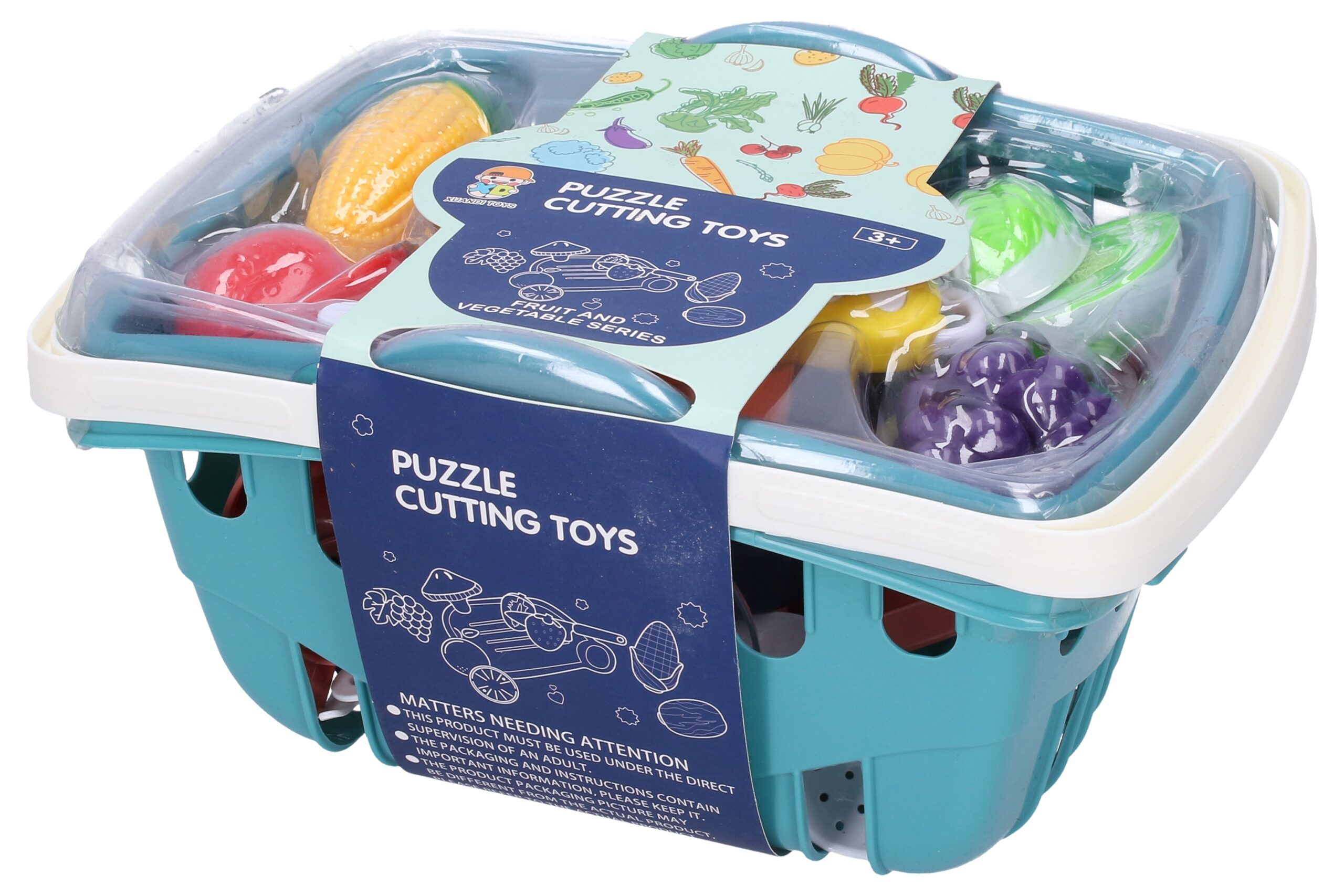 Kuchyňský set v košíku – modrý. Rozměry košíku 26x19x14 cm. Obsahuje rozkrojené ovoce a zeleninu, nůž a další nádobí.
