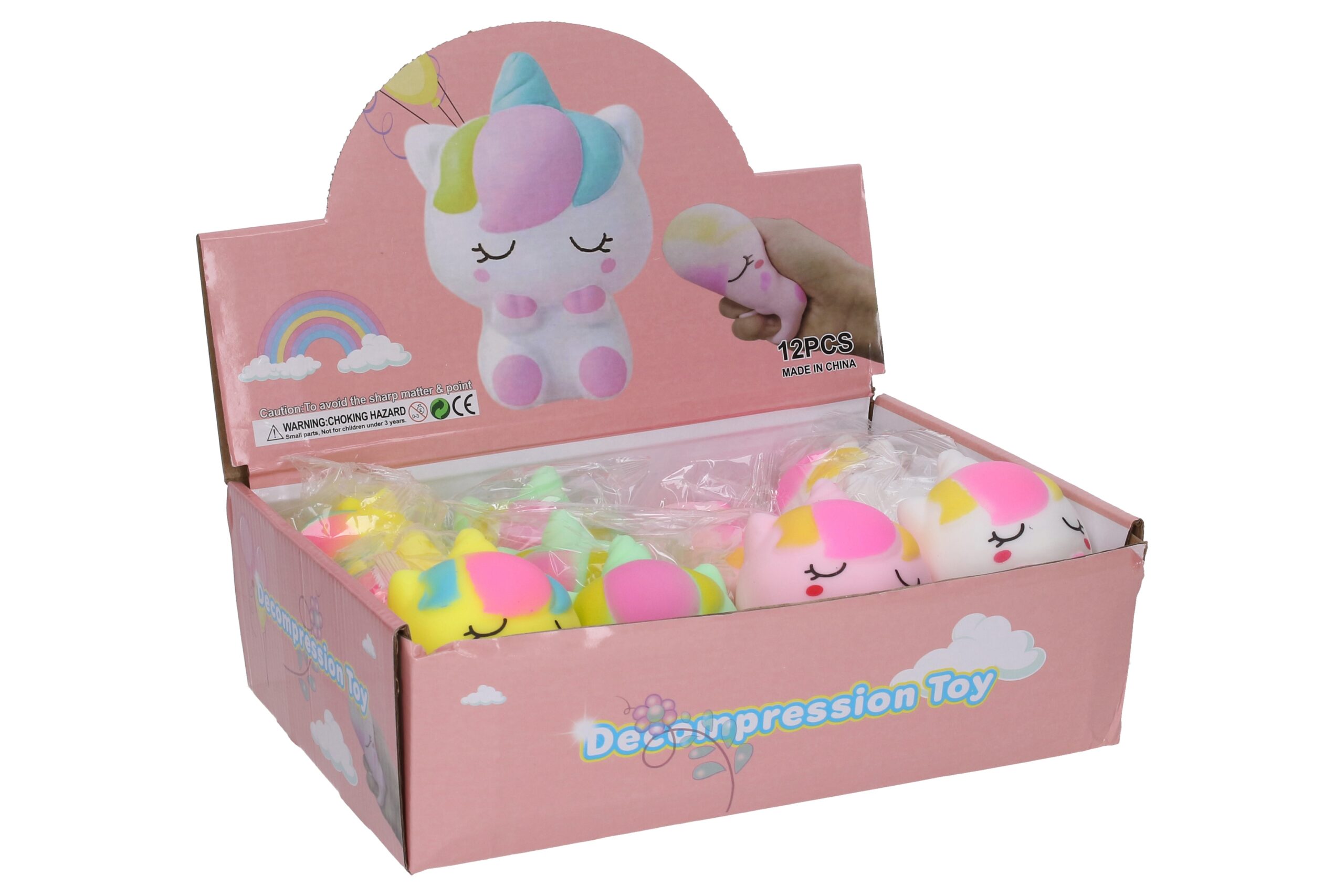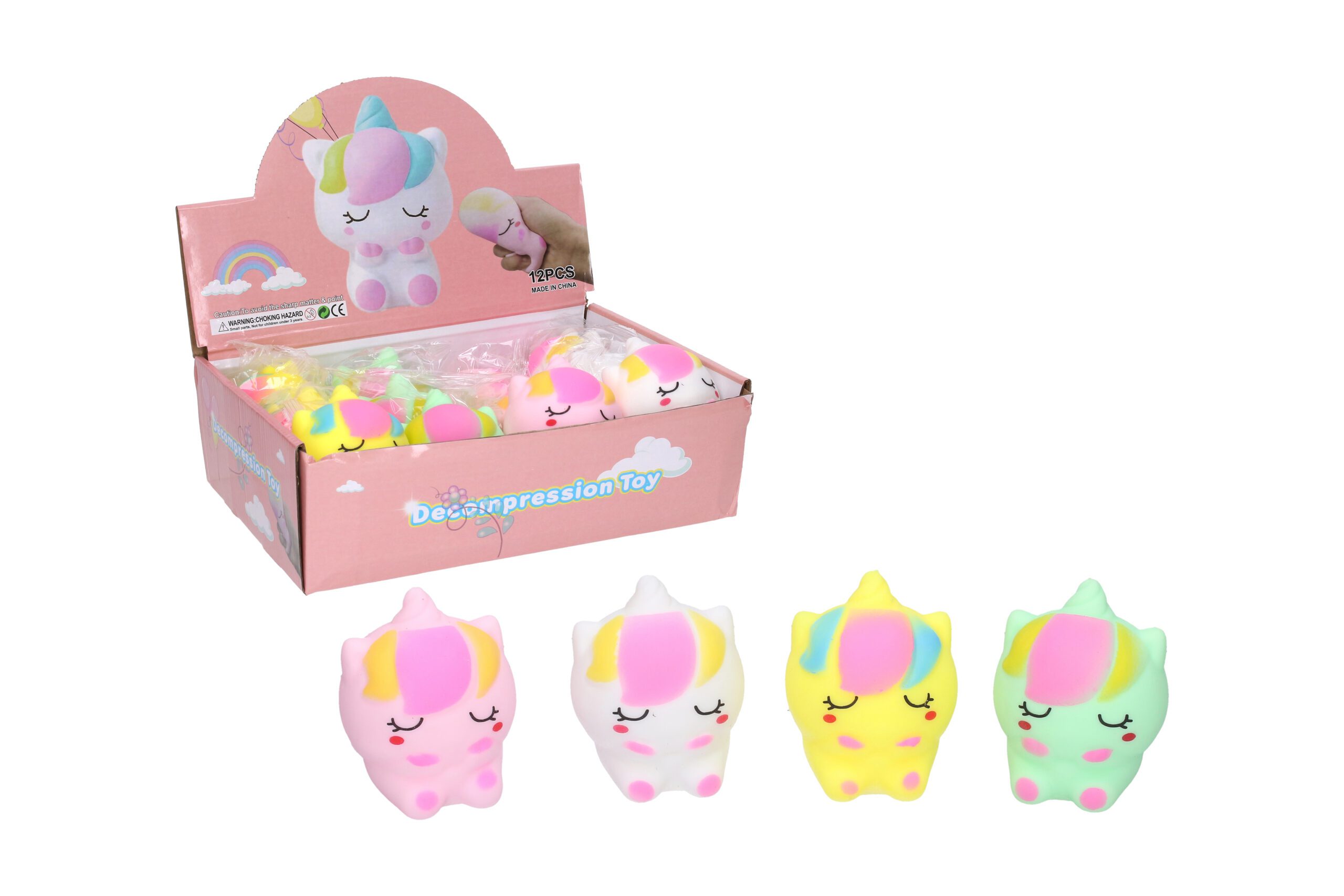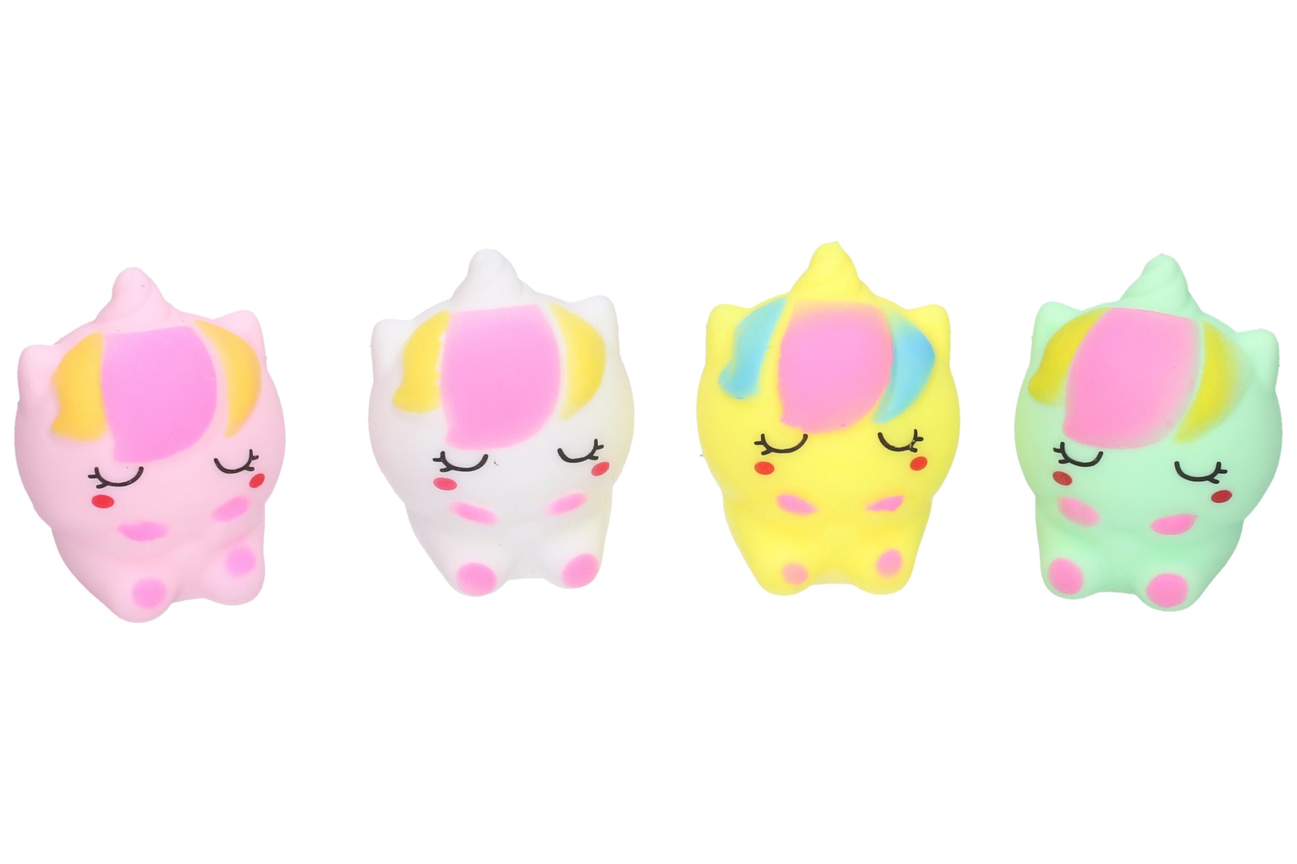 Mačkací jednorožec tvarovací. Velikost 8 cm. Display box 12 ks. 4 varianty – růžová, žlutá, bílá, zelená.