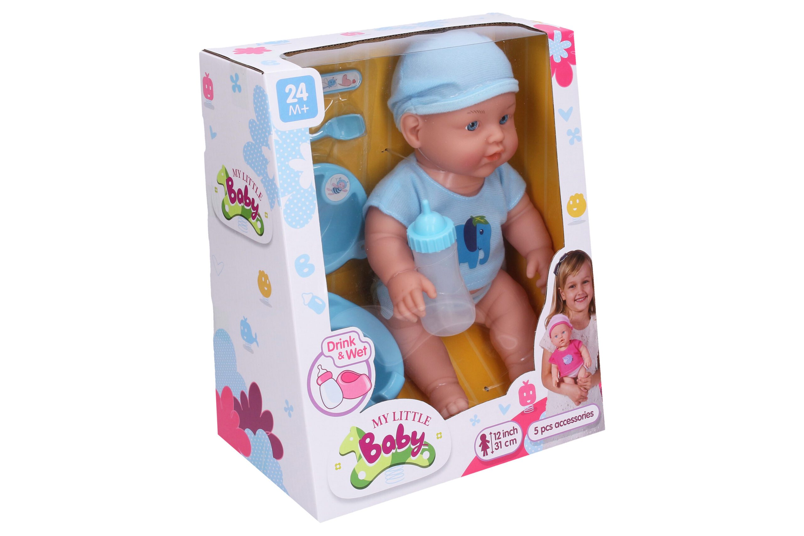 Miminko čůrající. Velikost 31 cm. Obsah balení – miminko, lžičky, miska, nočník, lahvička.