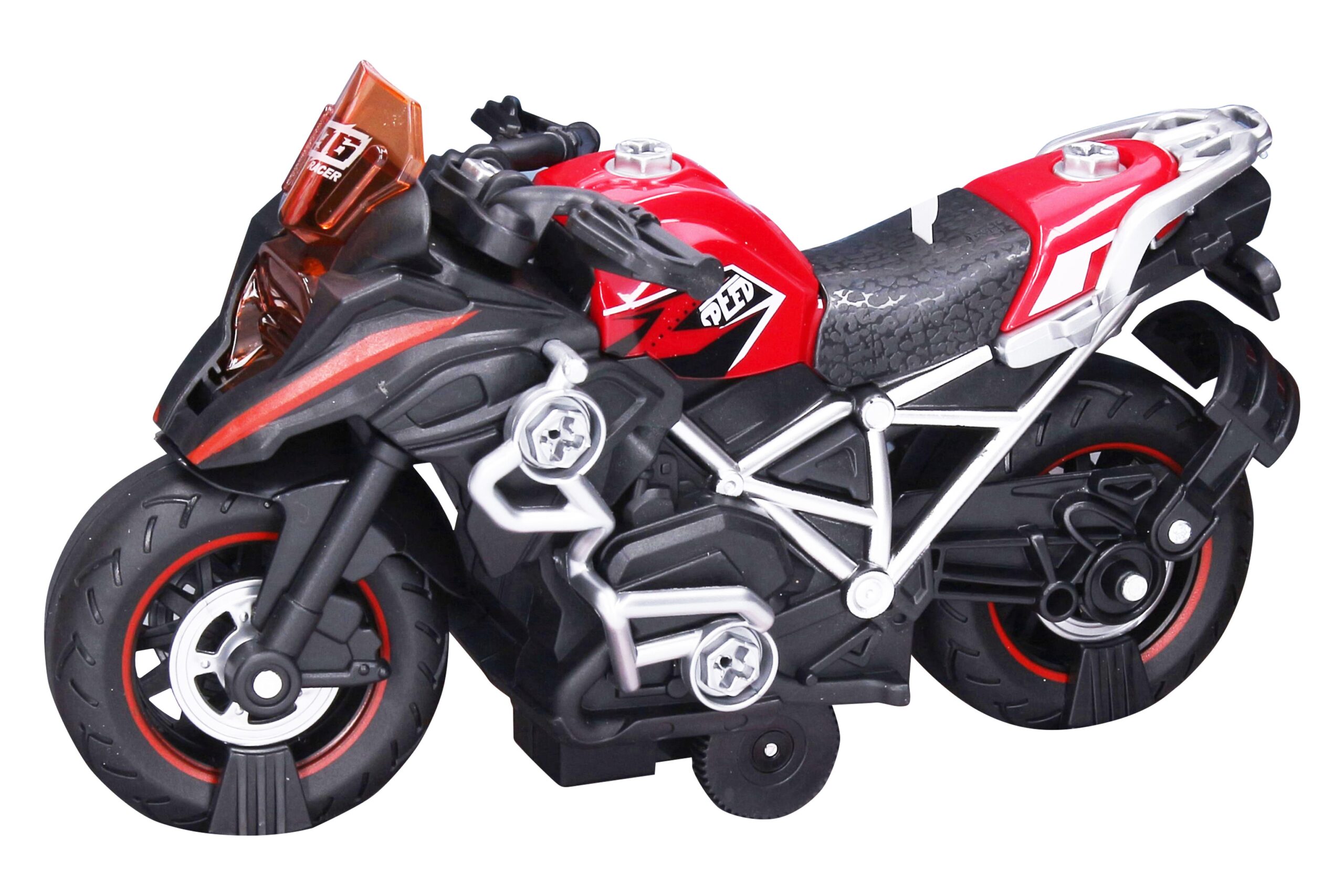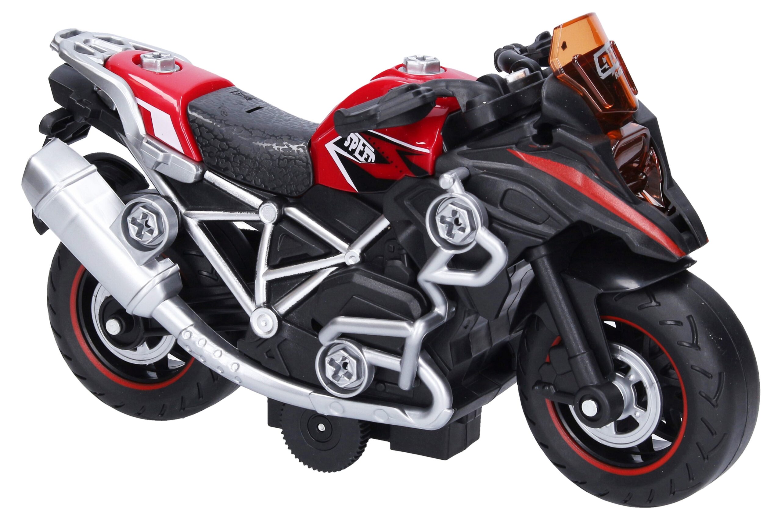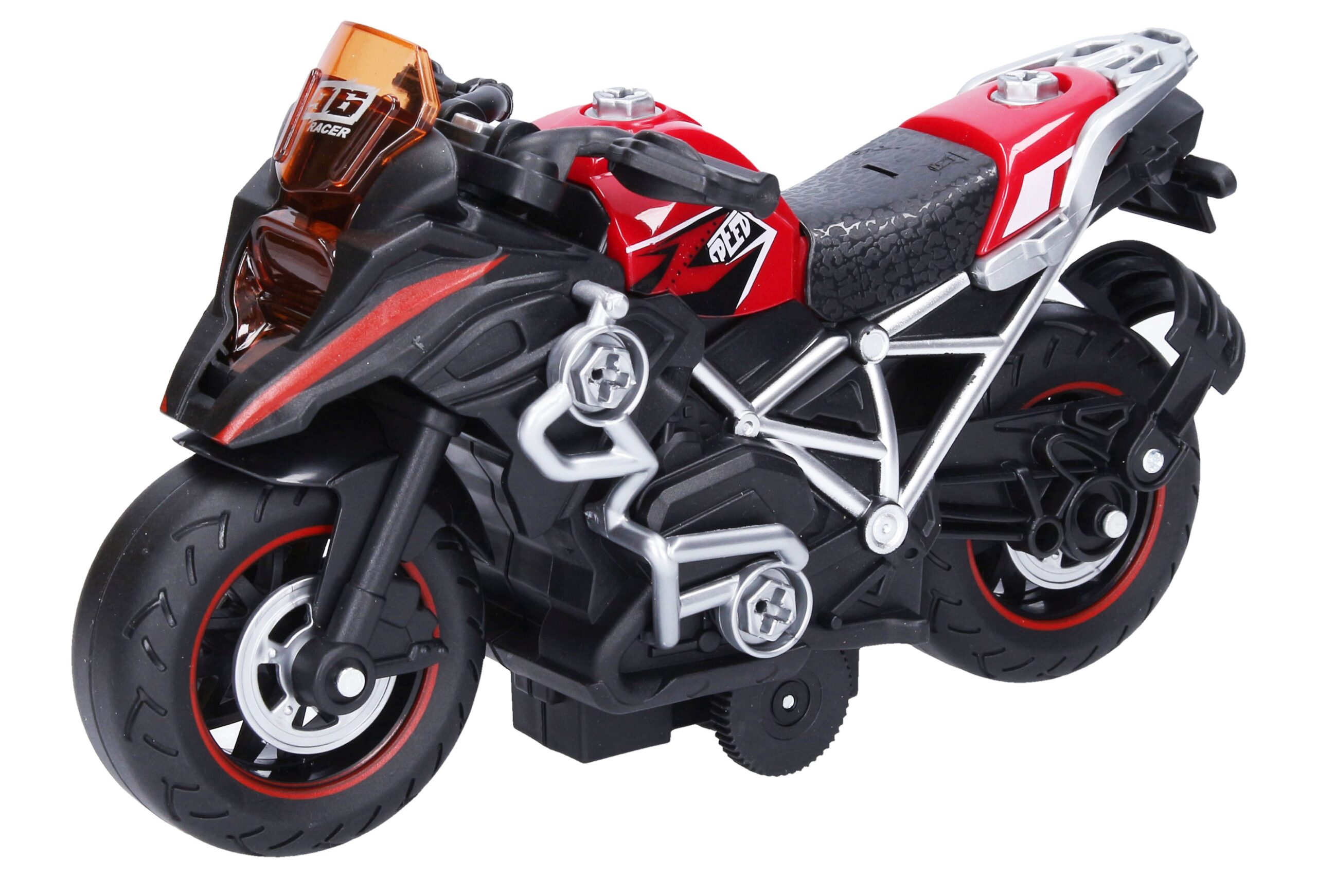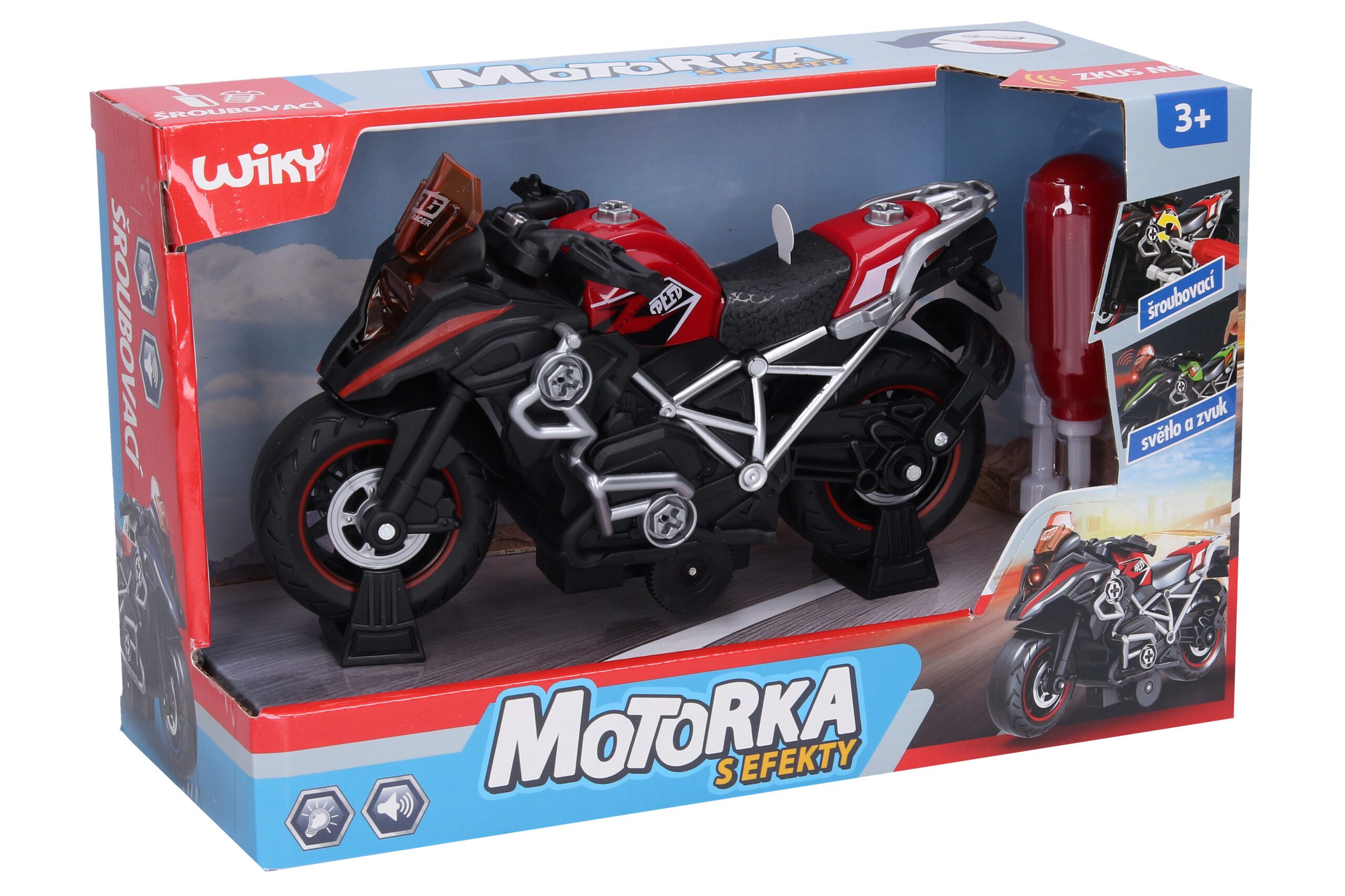 Motorka šroubovací s efekty červená. Rozměry 20×8,5×12 cm. Na setrvačník. Světelné a zvukové efekty zatlačením zadní části motorky dolů. 3xAG13 baterie součástí. Obsahuje motorku, šroubovák, klíč.