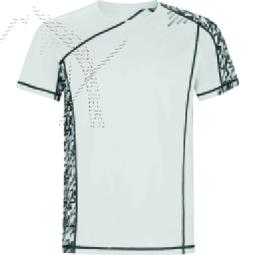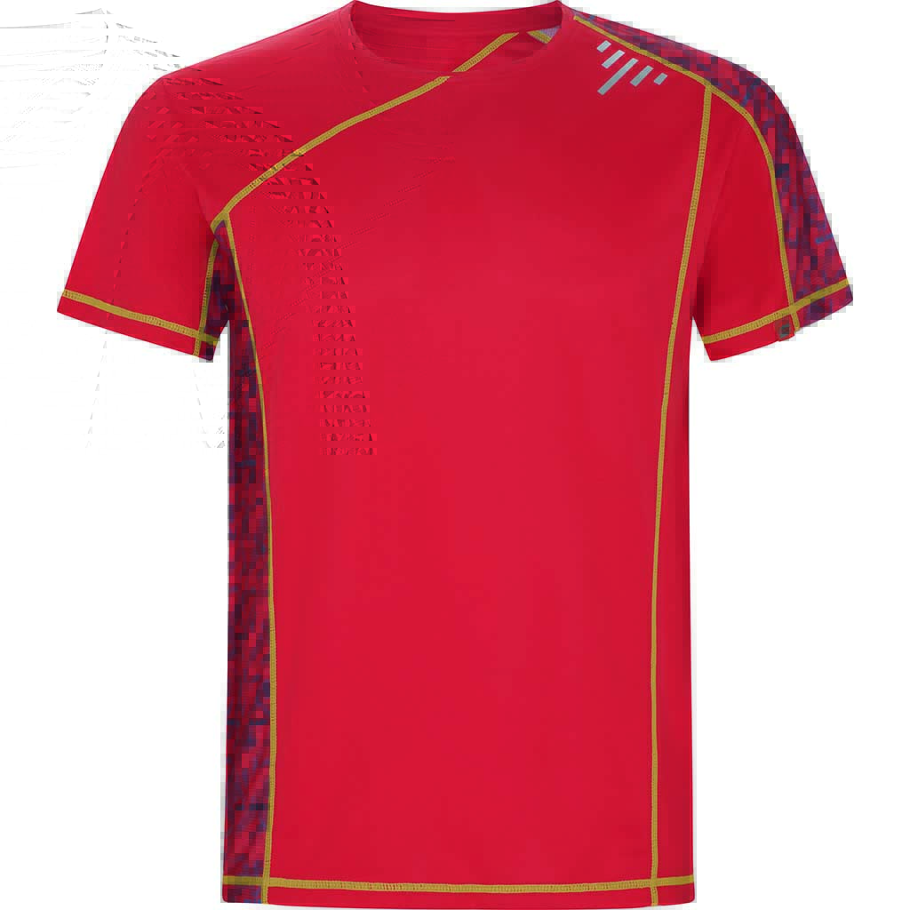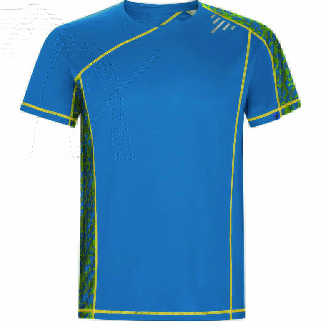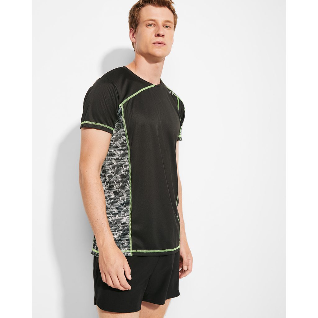 Sportovní tričko s raglánovými rukávy a potisknutými panely na levé straně ramene a pravém boku. Vyrobeno z materiálu s příměsí recyklovaného polyesteru. Prošití švů ve fluor barvě. Štítek s logem ECO na rukávu. Zabaleno samostatně v recyklovatelném sáčku.