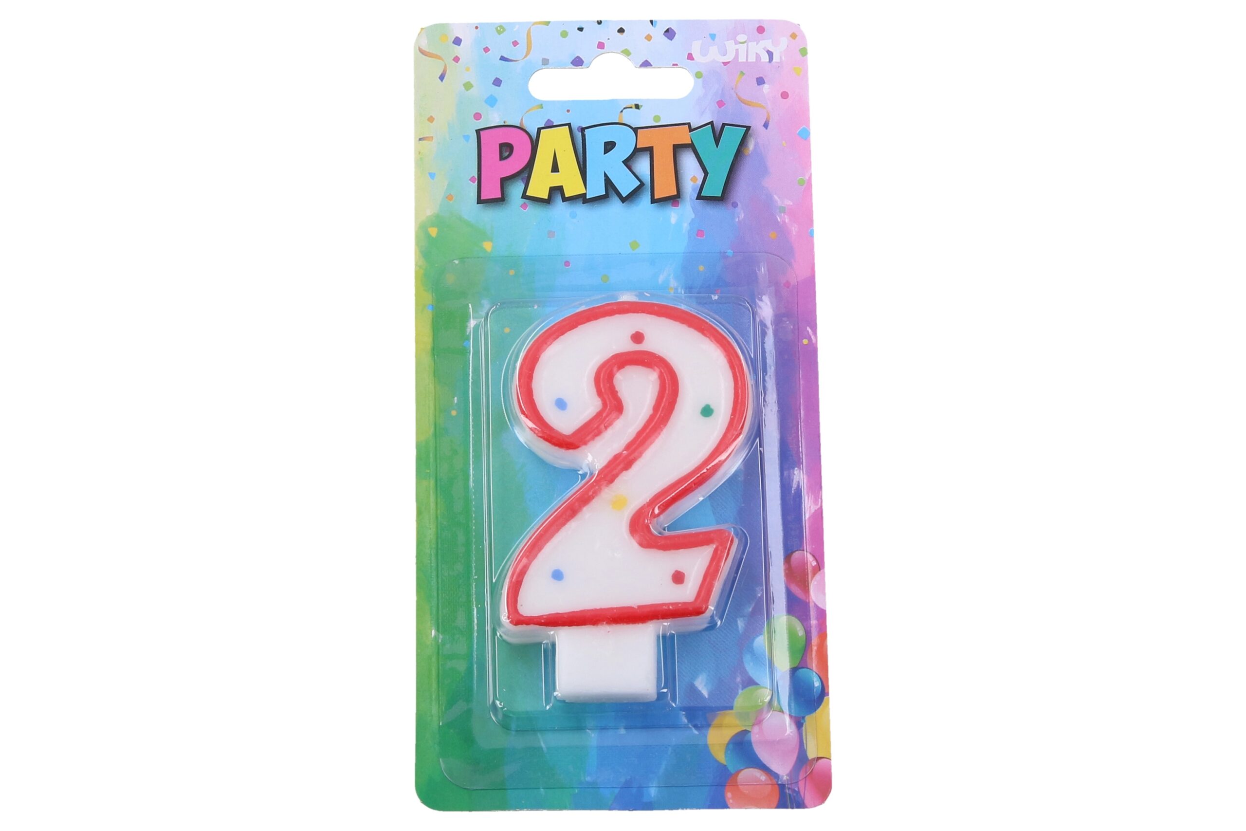 Party svíčka – číslo 2 – bílá s červenými okraji a barevnými puntíky