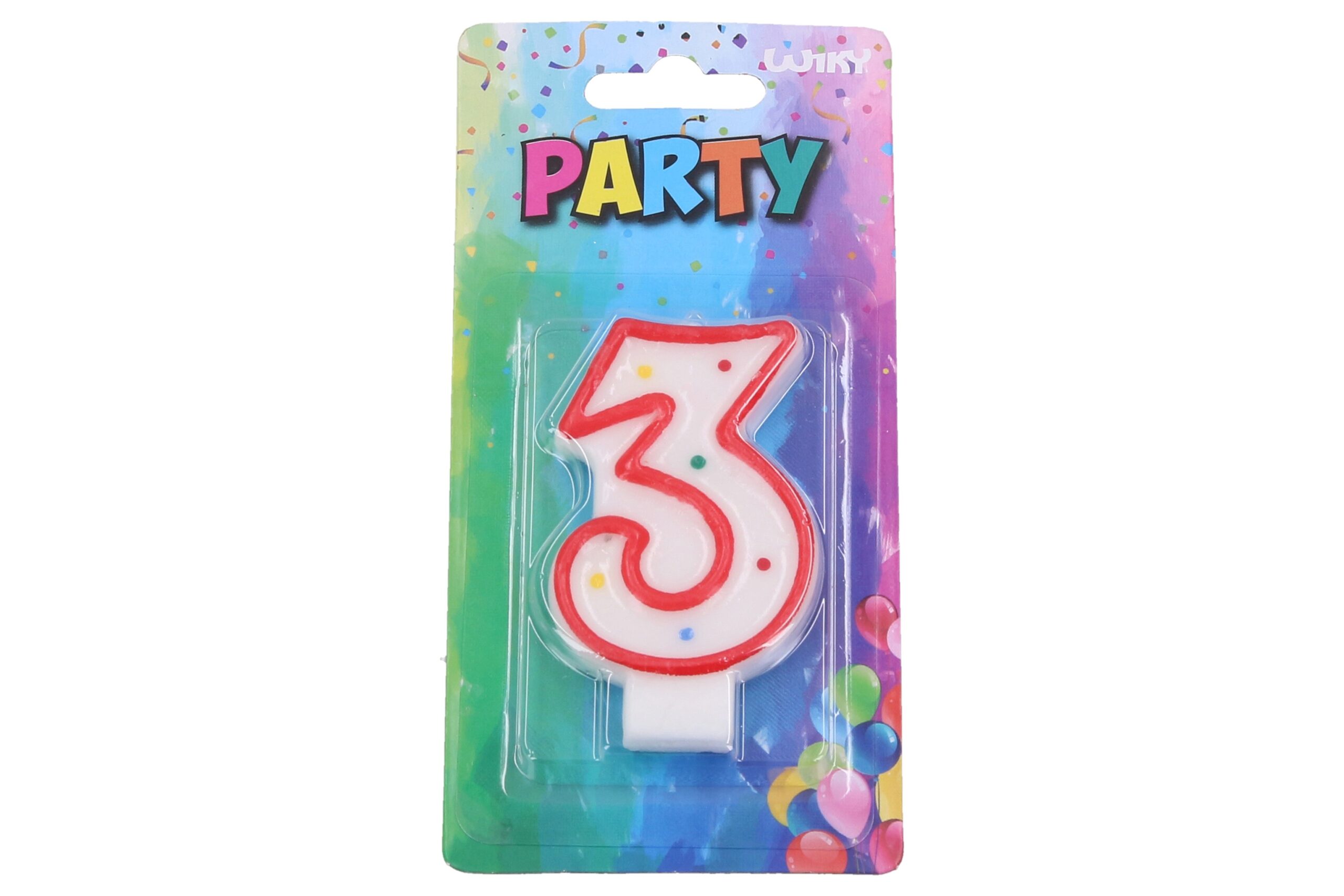 Party svíčka – číslo 3 – bílá s červenými okraji a barevnými puntíky