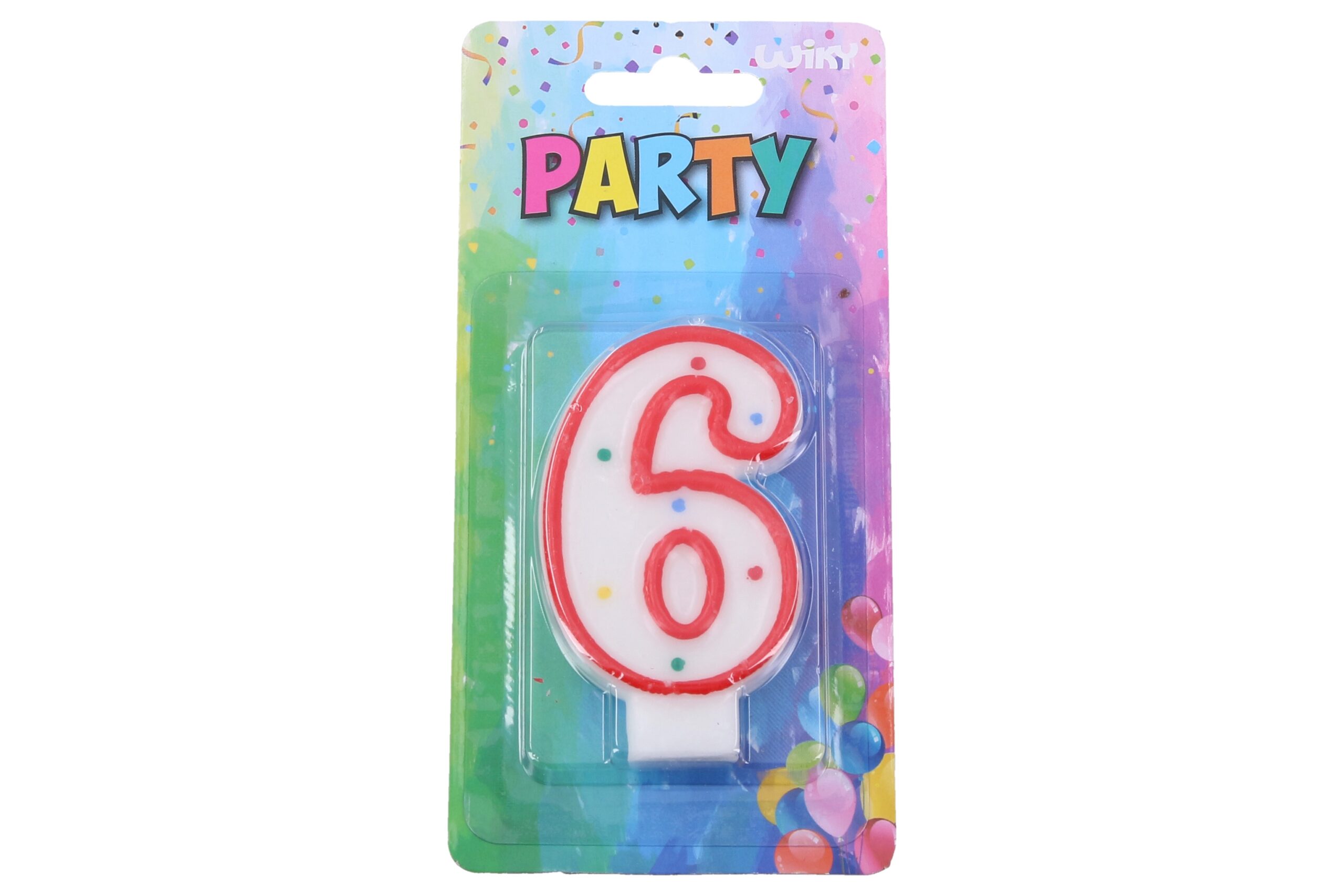 Party svíčka – číslo 6. – bílá s červenými okraji a barevnými puntíky.