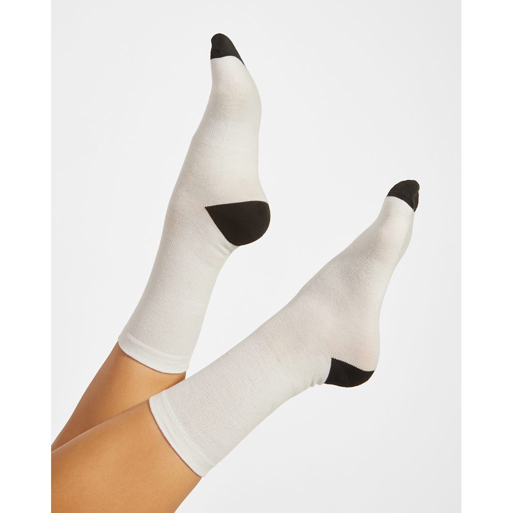 Ponožky do půli lýtek pro sublimaci. Pata s špička v černé barvě. Tkanina na dotyk bavlnněná.