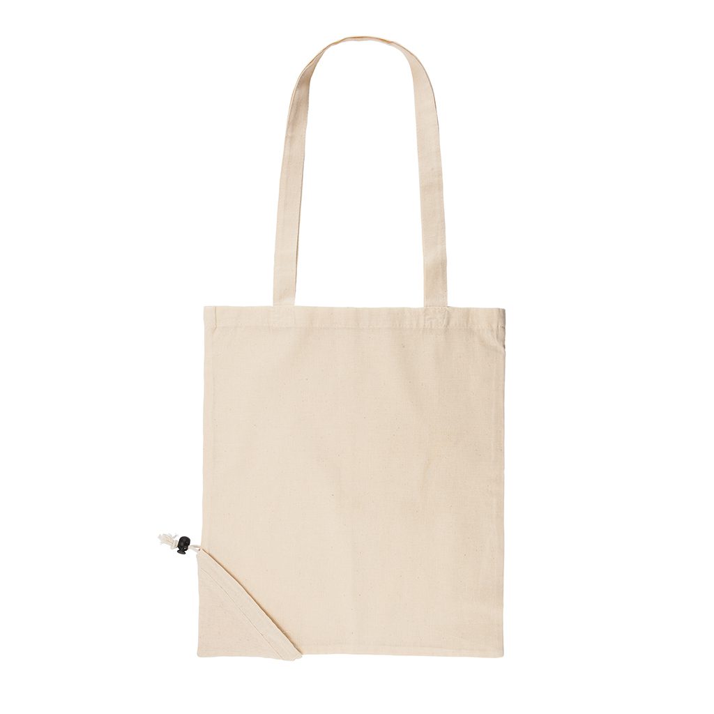 Skládací nákupní taška ze 100% bavlny o gramáži 105 g/m², se 70 cm dlouhými uchy a nastavitelným skládacím pytlíkem se stahovací šňůrkou.