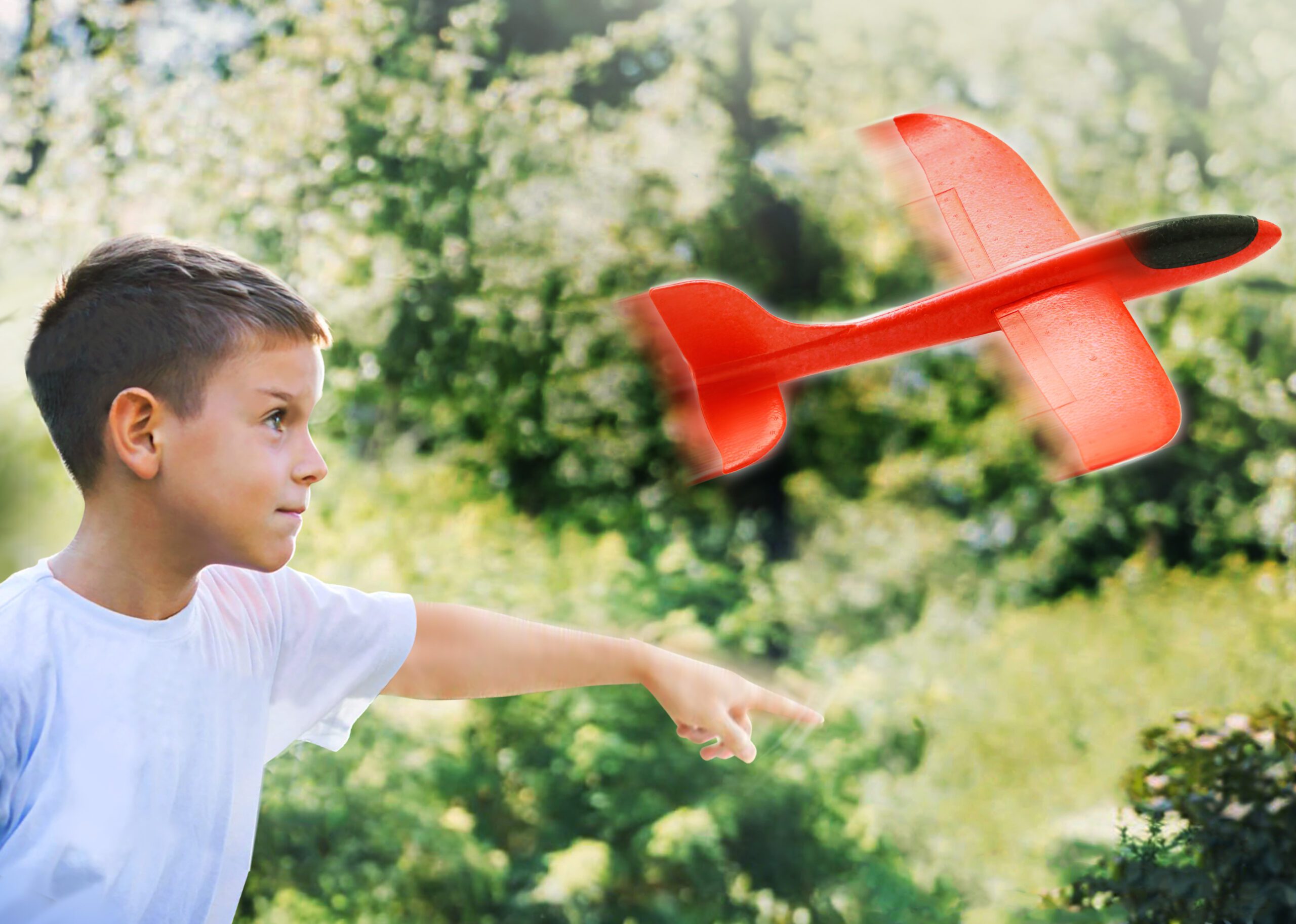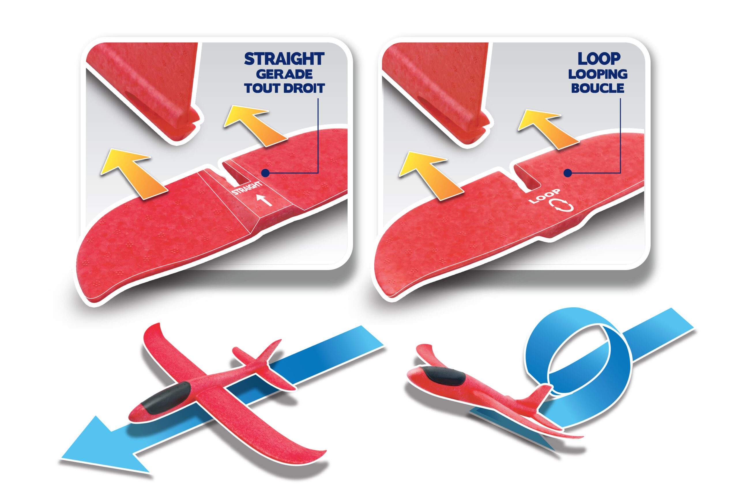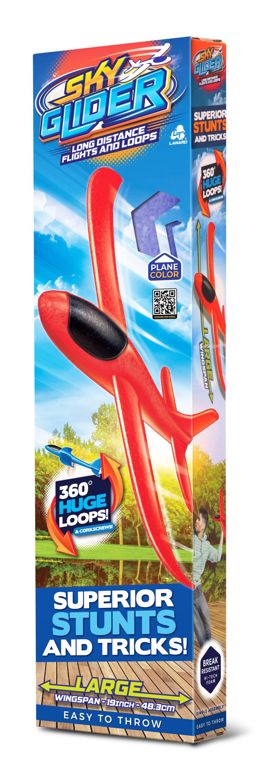 Sky Glider Letadlo házecí. Rozpětí křídel 48 cm. Lze upravit ocasní plochy, pro let vpřed nebo ve smyčce. Může letět až 30m. 2 varianty – modrá, červená. Návod na používání na zadní straně obalu.