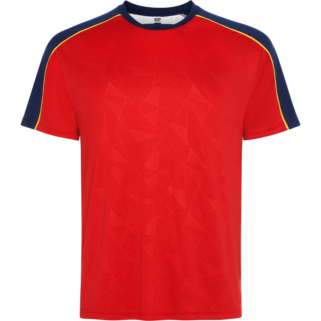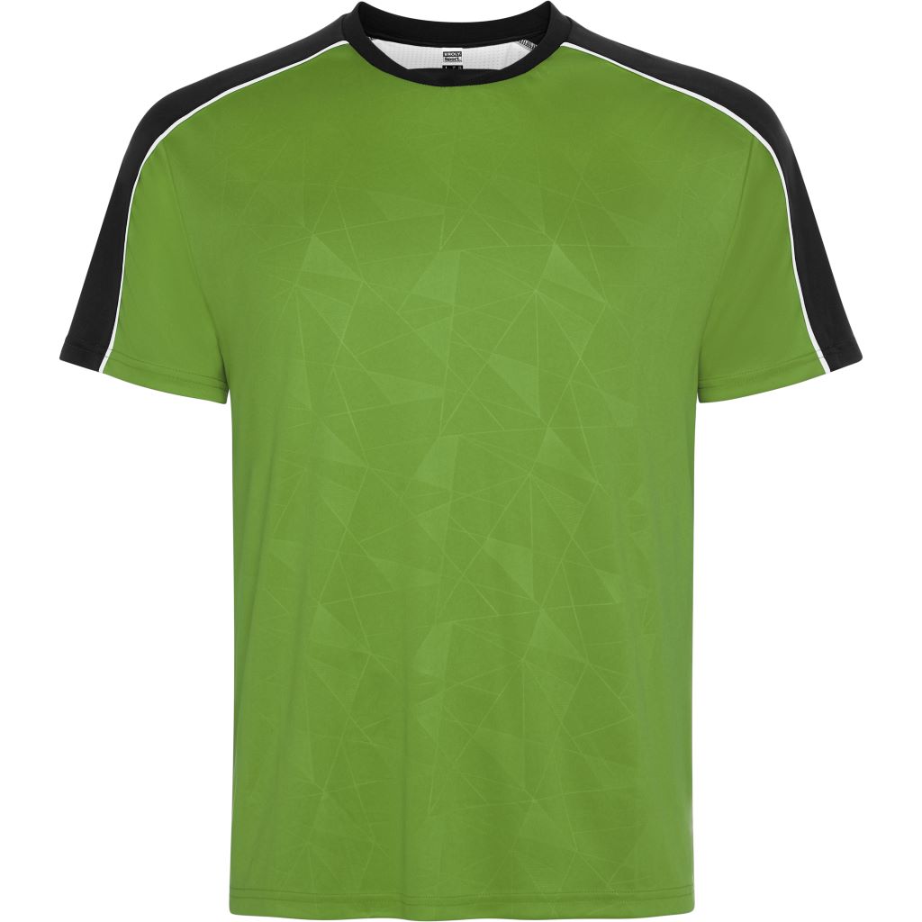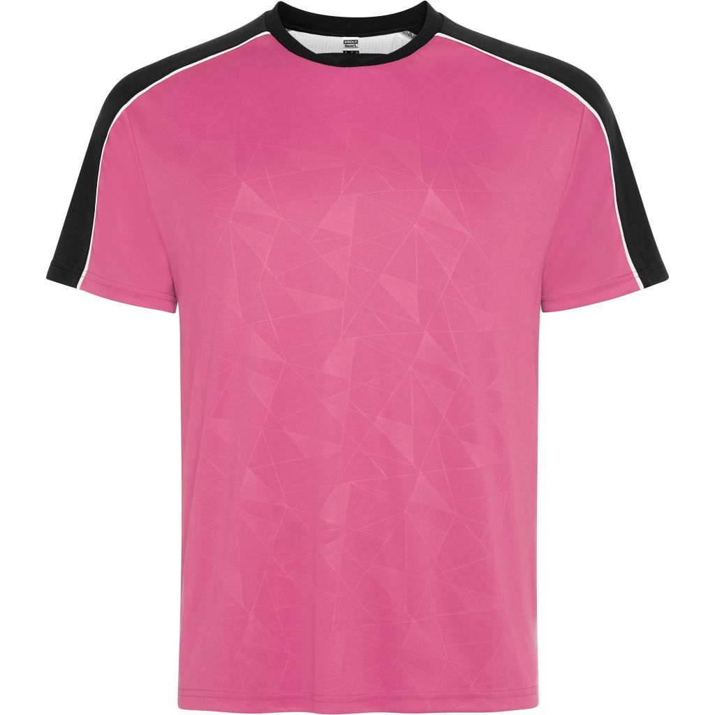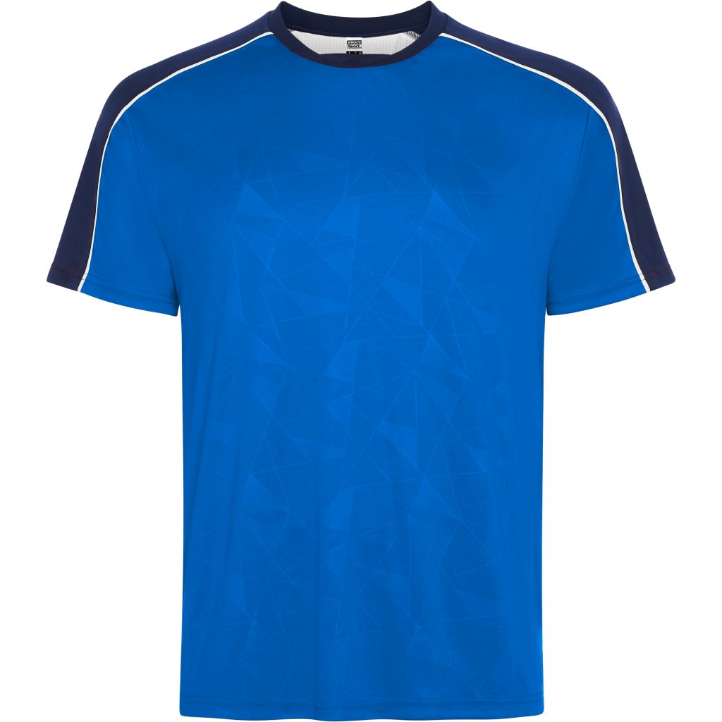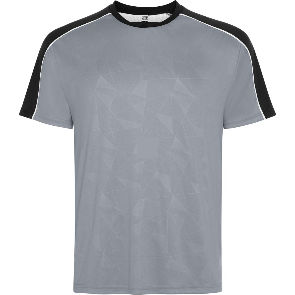 Sportovní souprava obsahující tričko s krátkým rukávem a šortky. Potisk na předním panelu. Potisk na raglánových švech rukávů. Detail ze síťoviny uprostřed zad, ponechaný volný pro další zpracování. Kalhoty z hlavní tkaniny s bočními pruhy z prodyšné tkaniny. Kontrastní lemování švů.