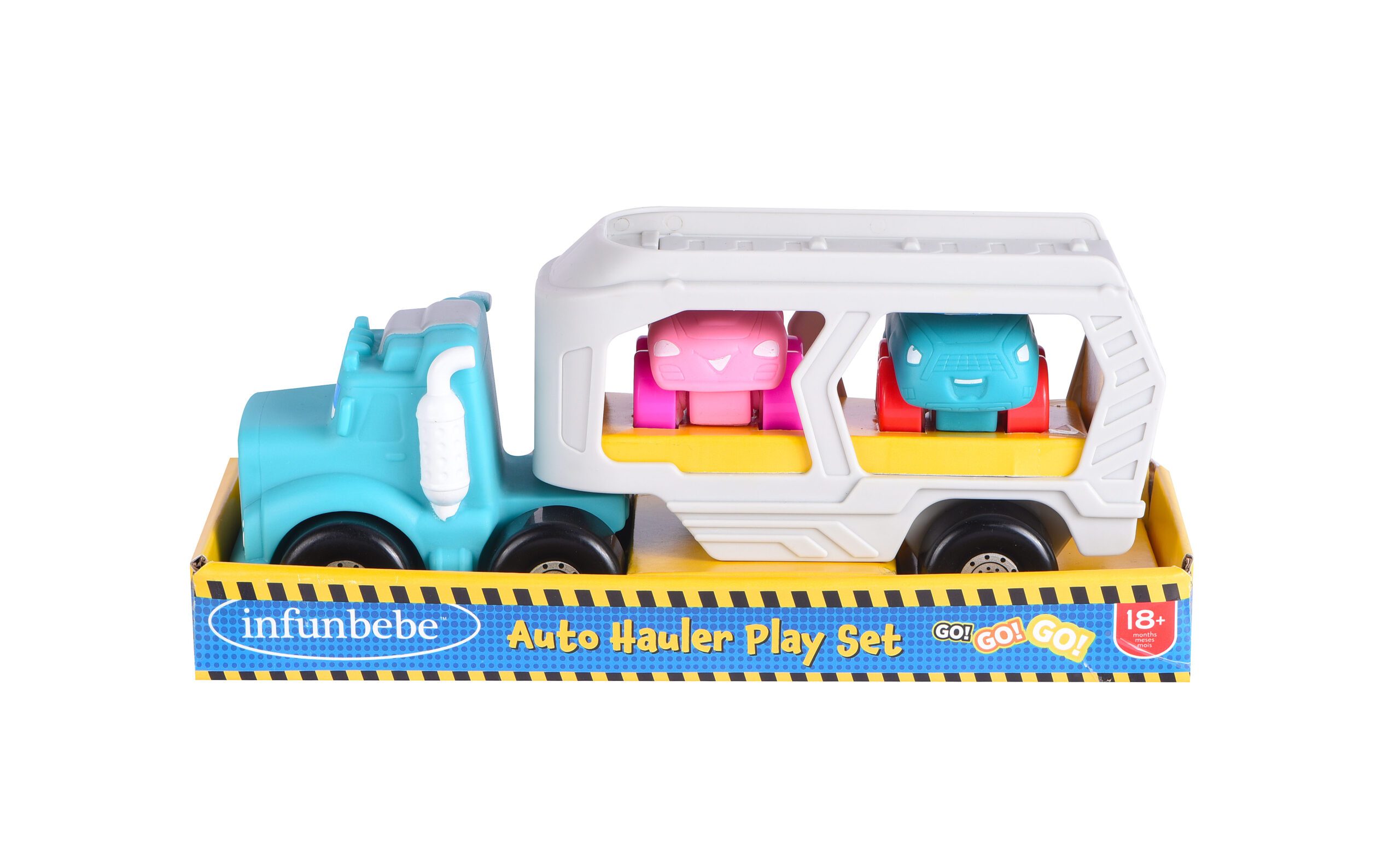 Tahač s auty. Velikost tahače 24 cm. Obsahuje tahač a dvě auta. Volná kola.