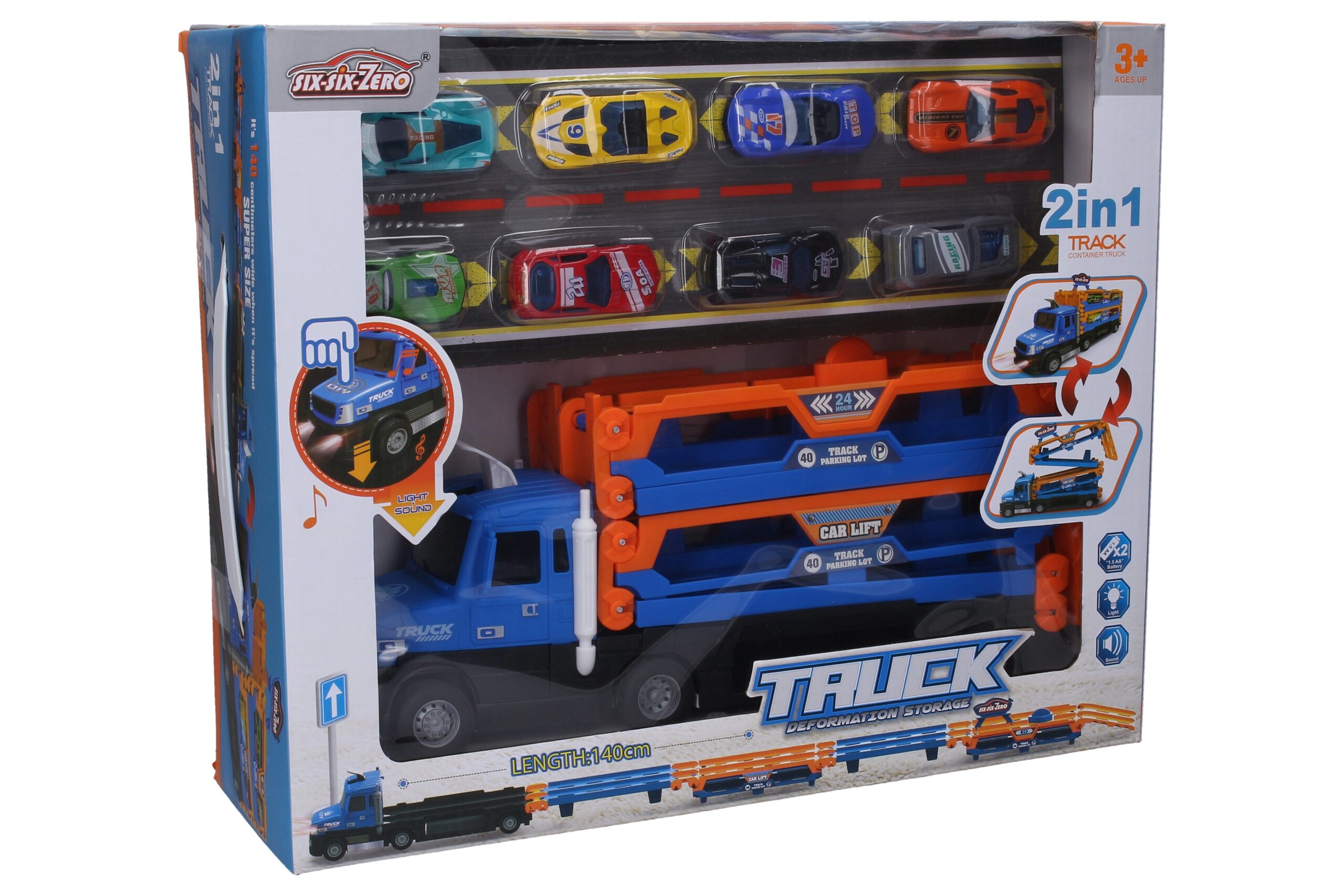 Auto tahač s vystřelovací dráhou na auta. Rozměry složeného tahače 34×9,5×18 cm. Délka vystřelovací dráhy v rozloženém stavu 140 cm. Tahač vydává světelné a zvukové efekty. Aktivace stiskem kapoty. 2xAA baterie, nejsou součástí balení. Součástí balení je 8 kovových autíček 6,5 cm, volná kola.