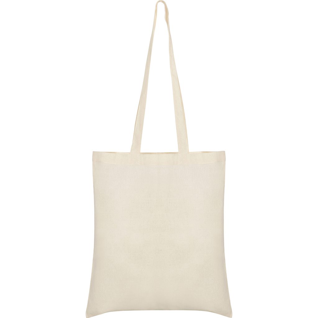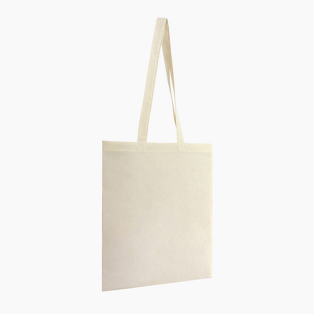 Nákupní taška vyrobená z bavlněné tkaniny v přírodní barvě.