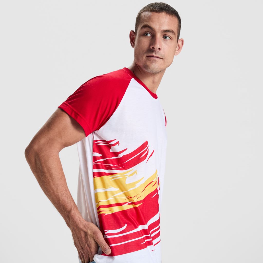 Tričko s krátkým rukávem a bočními švy. Polyester, který na dotyk připomíná bavlnu. Kulatý výstřih z hlavní tkaniny ve stejné barvě jako barva rukávů. Podlepený výstřih ze stejné tkaniny ladící s odstínem rukávů.