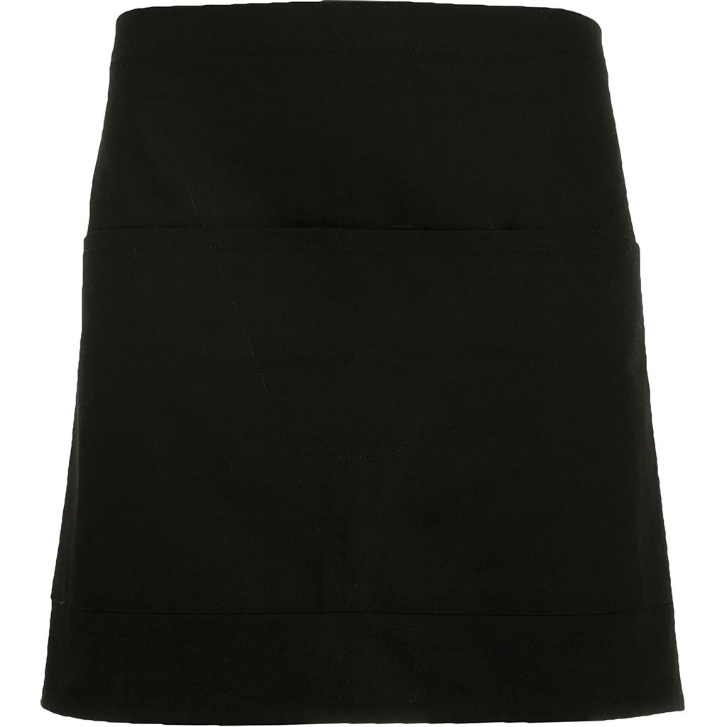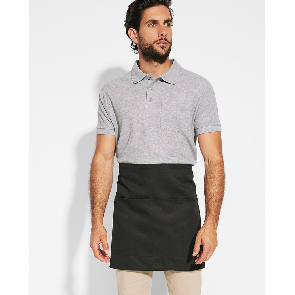 Kratší zástěra se dvěma kapsami. Postranní šňůrky na uvázání. Rozměry: 71 cm x 43 cm.